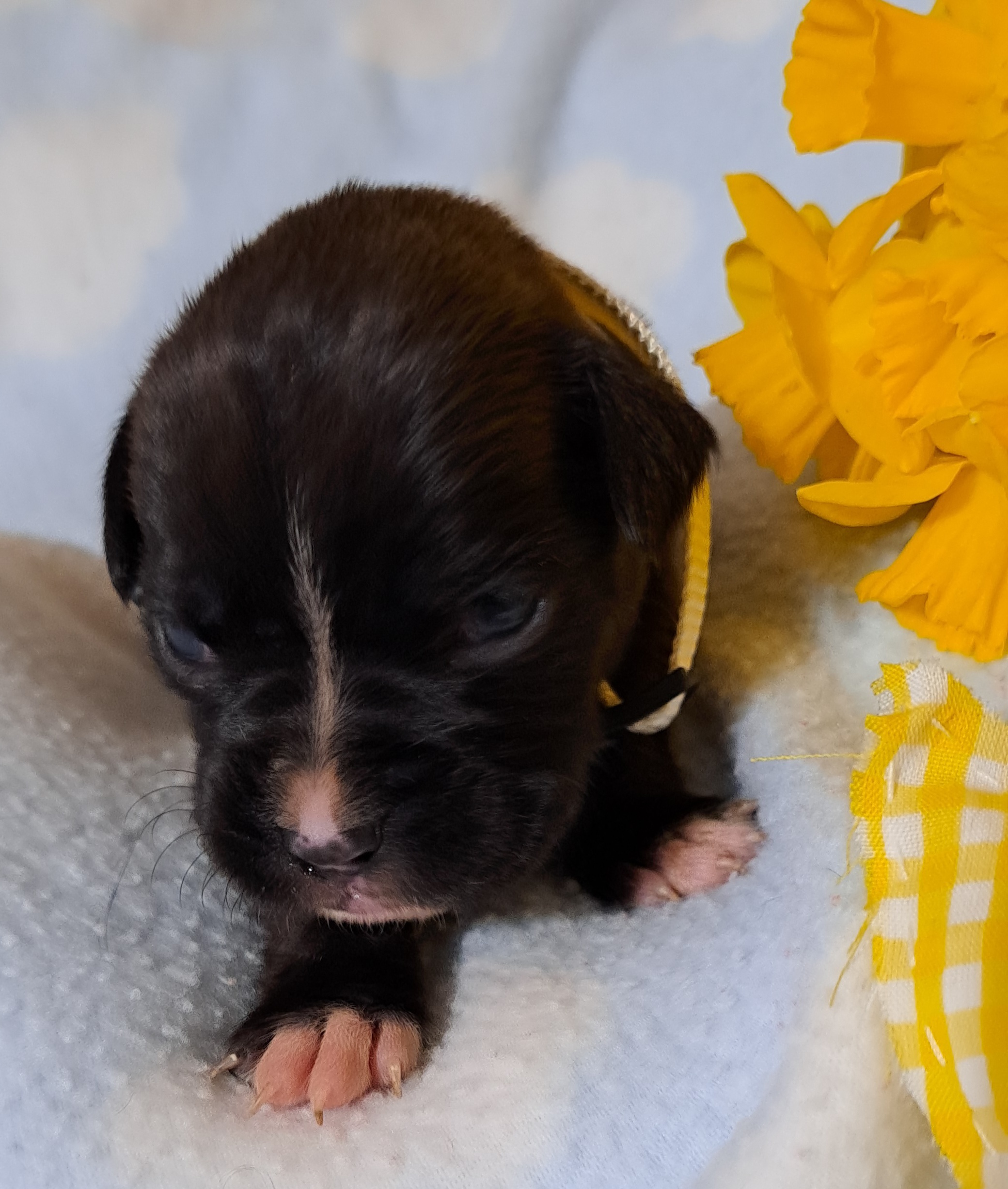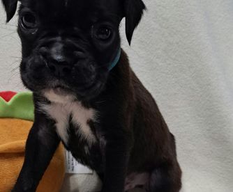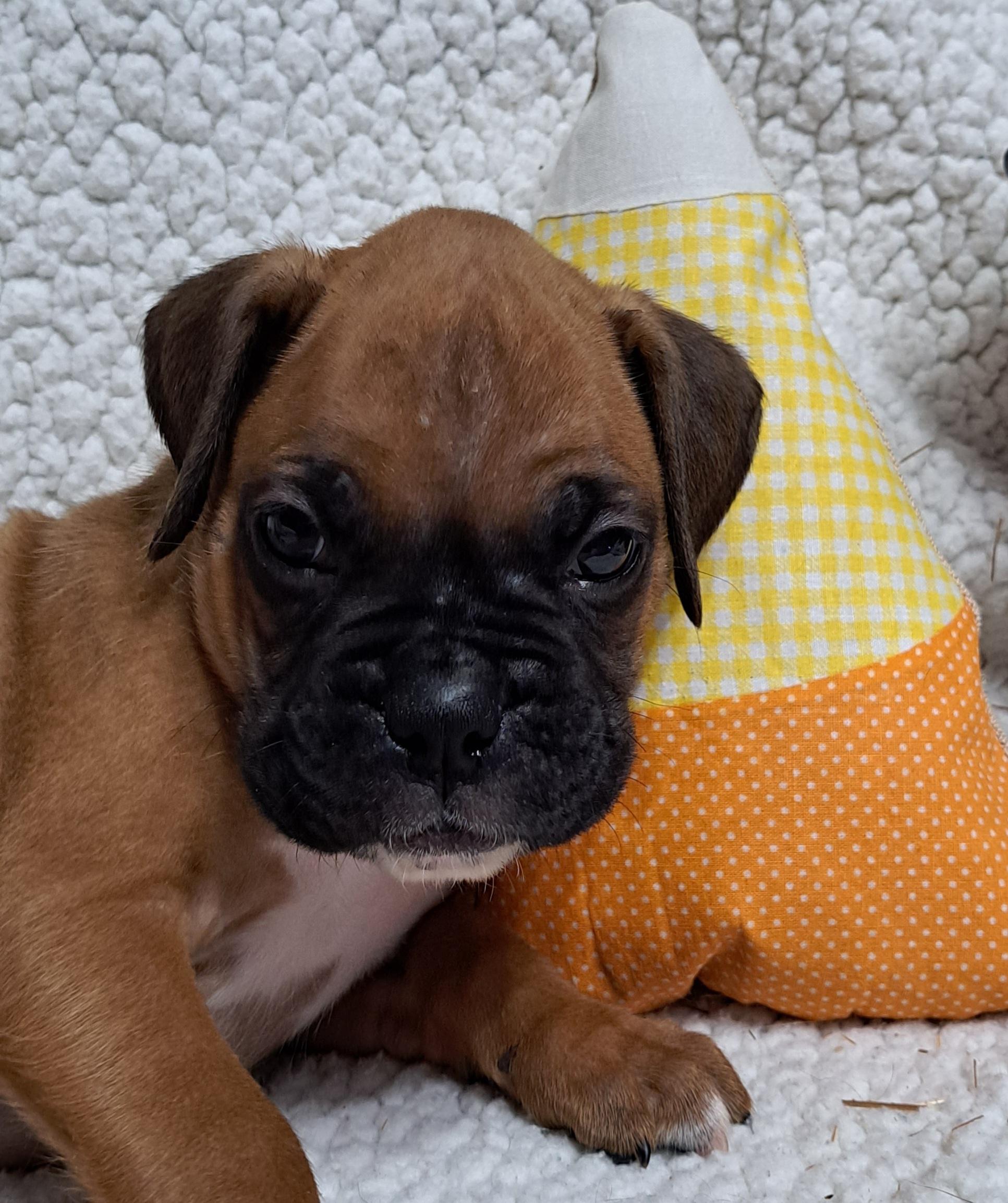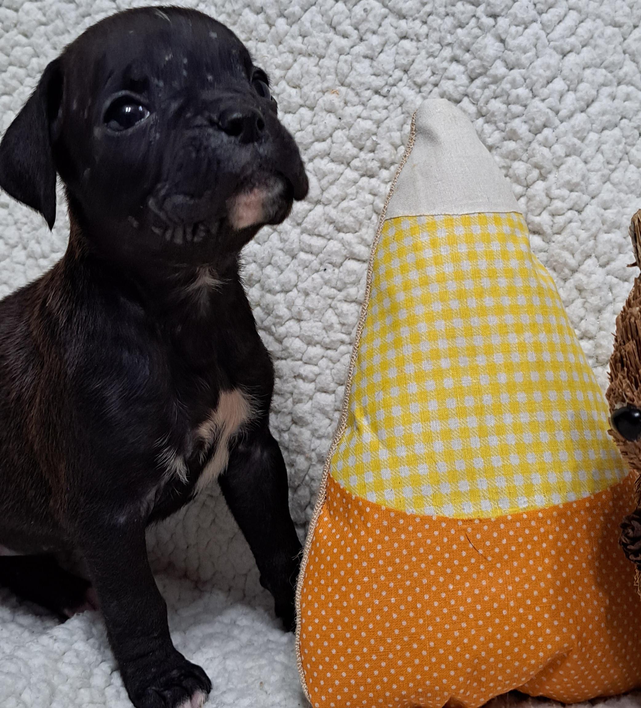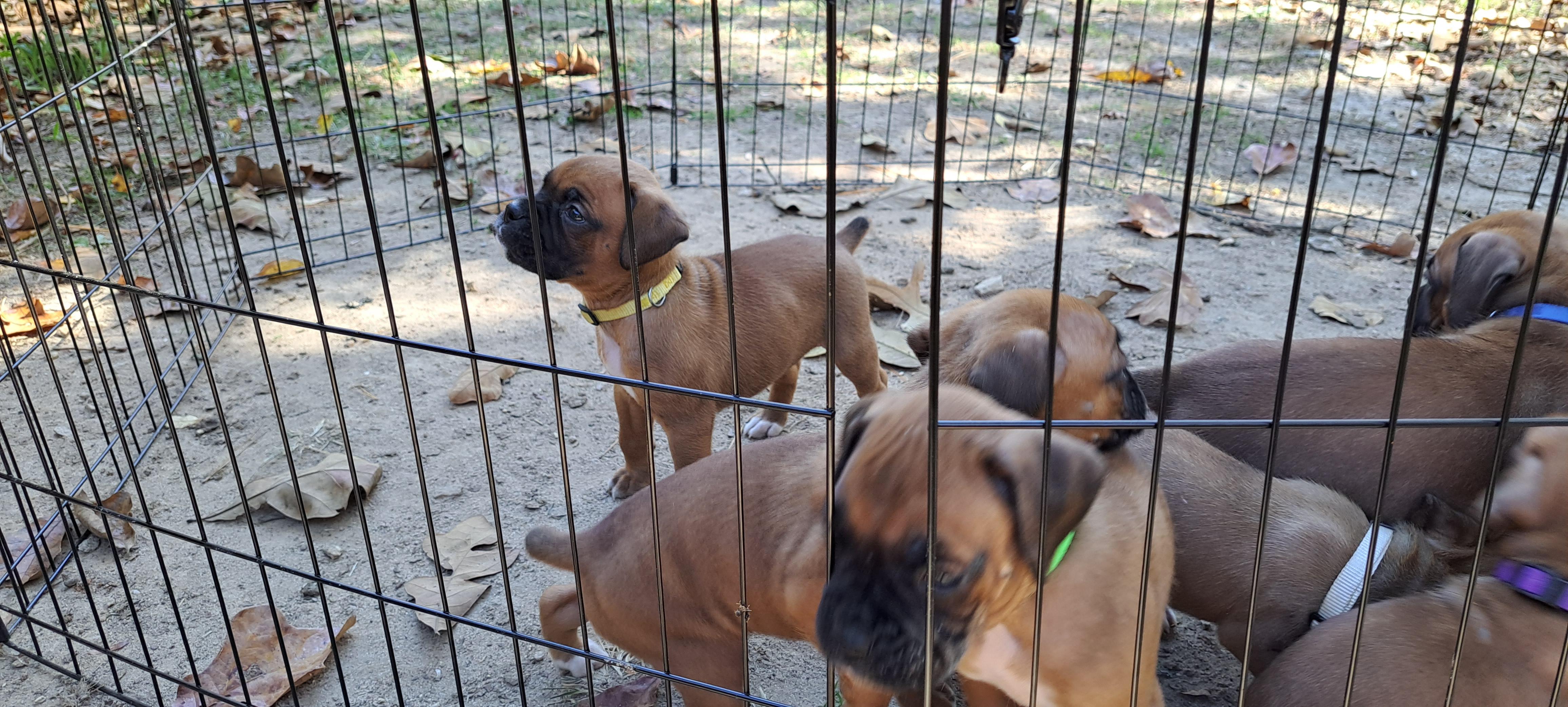 Our Boxer puppies include brindle and white. Dachshund puppies include piebald, cream, chocolate, blue and cream, chocolate and cream, black and tan, and black and cream. Colors will vary depending on the parent dogs.