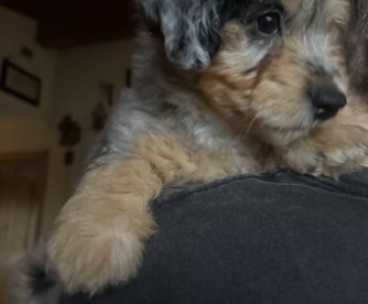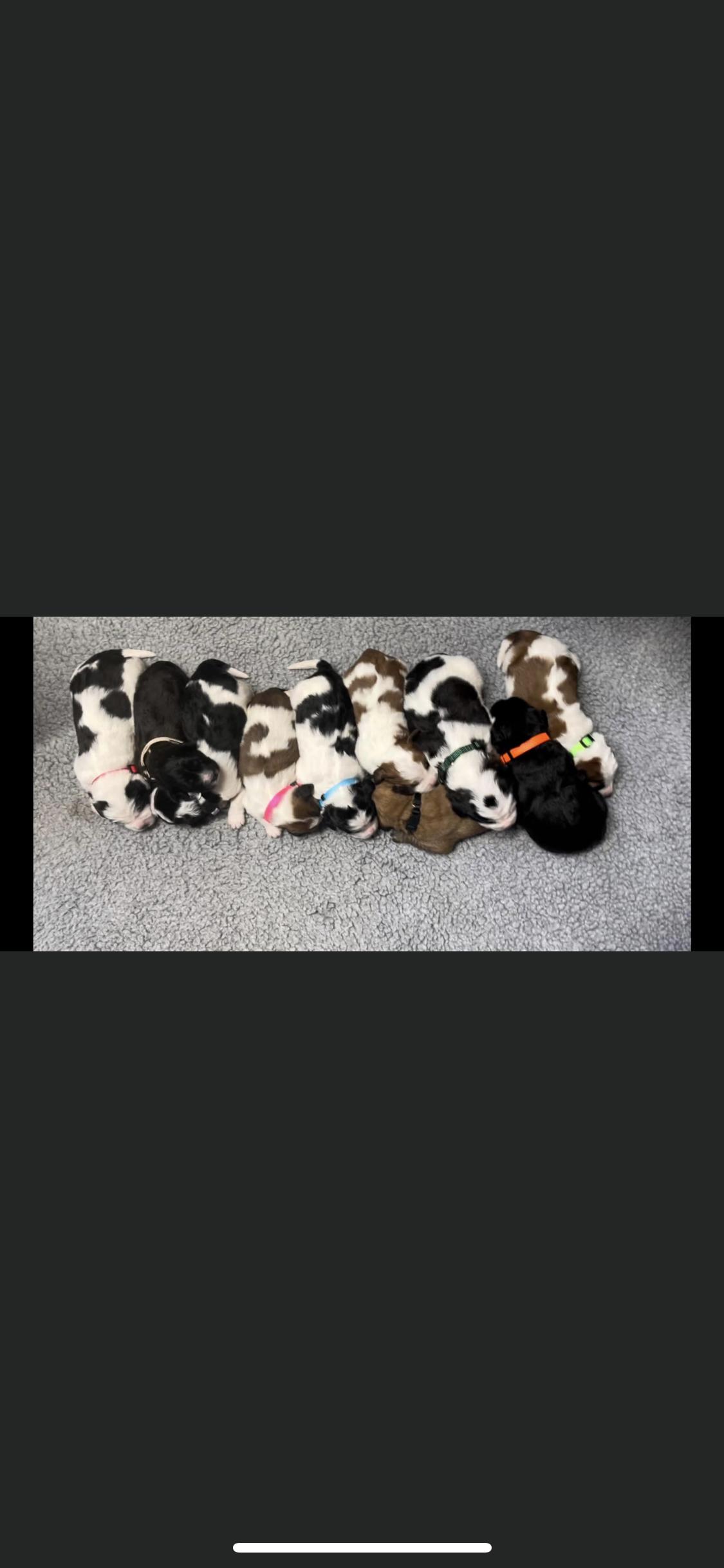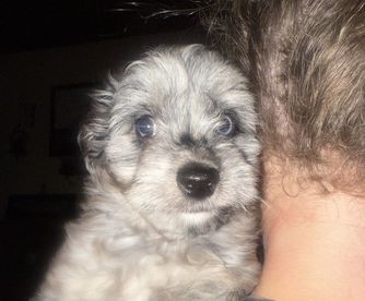 Our Aussiedoodle puppies are blue merle. Colors will vary depending on the parent dogs.