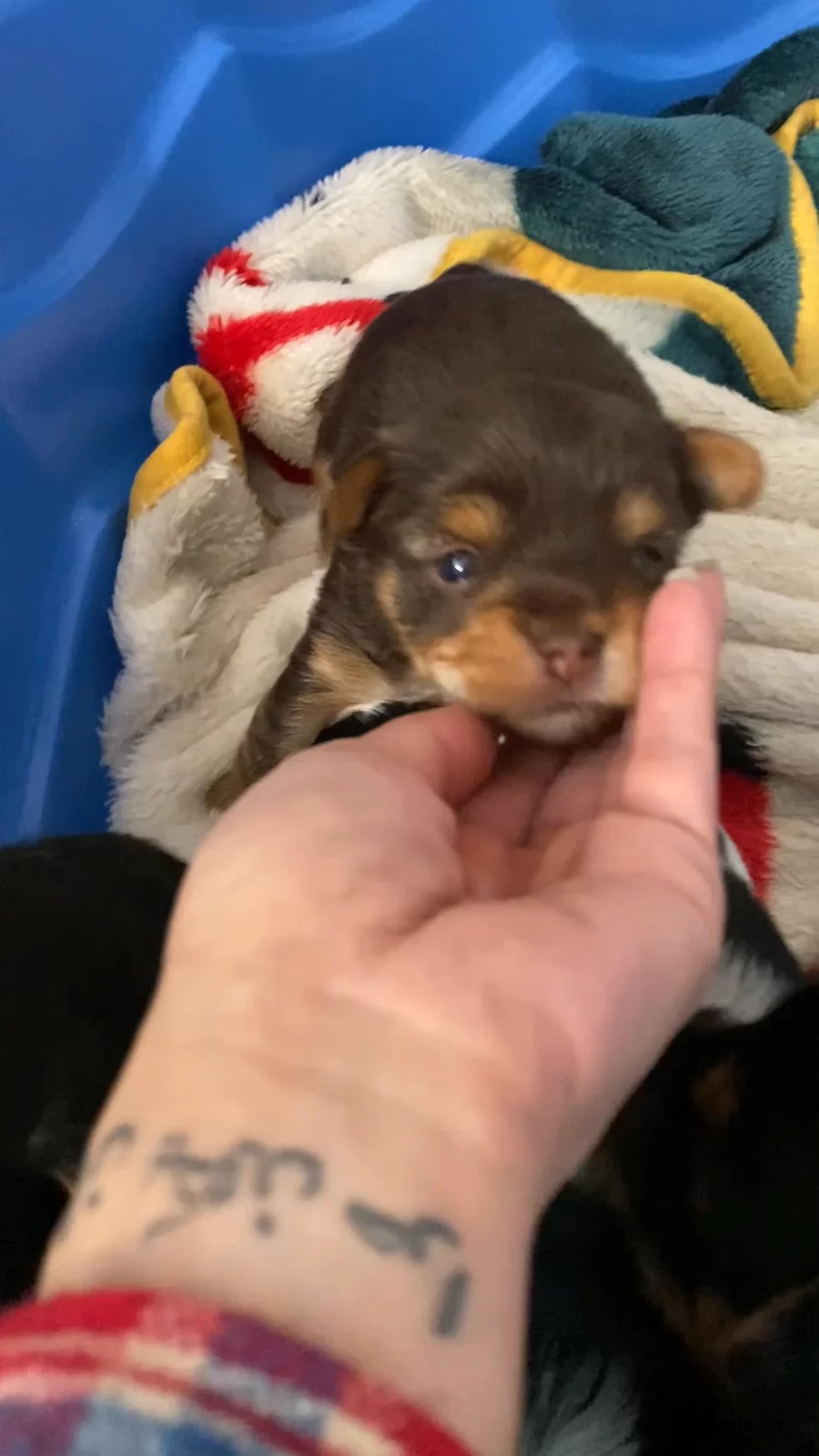 Vel 🩵 3 weeks old on 2/18. Weighing in at 1.36lbs. 1 of 4 traditional Yorkie girls we have available. Ready for adoption on 5/25.