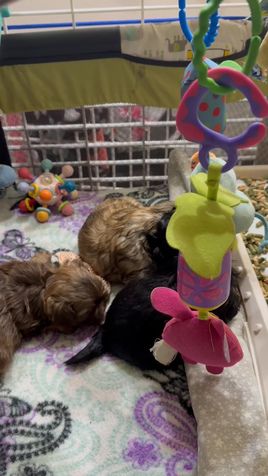 Their eyes are fully open, they’re starting to wobble walk, and they’ve found their little voices — soft, playful barks that sound like tiny dinosaurs 🦕💙