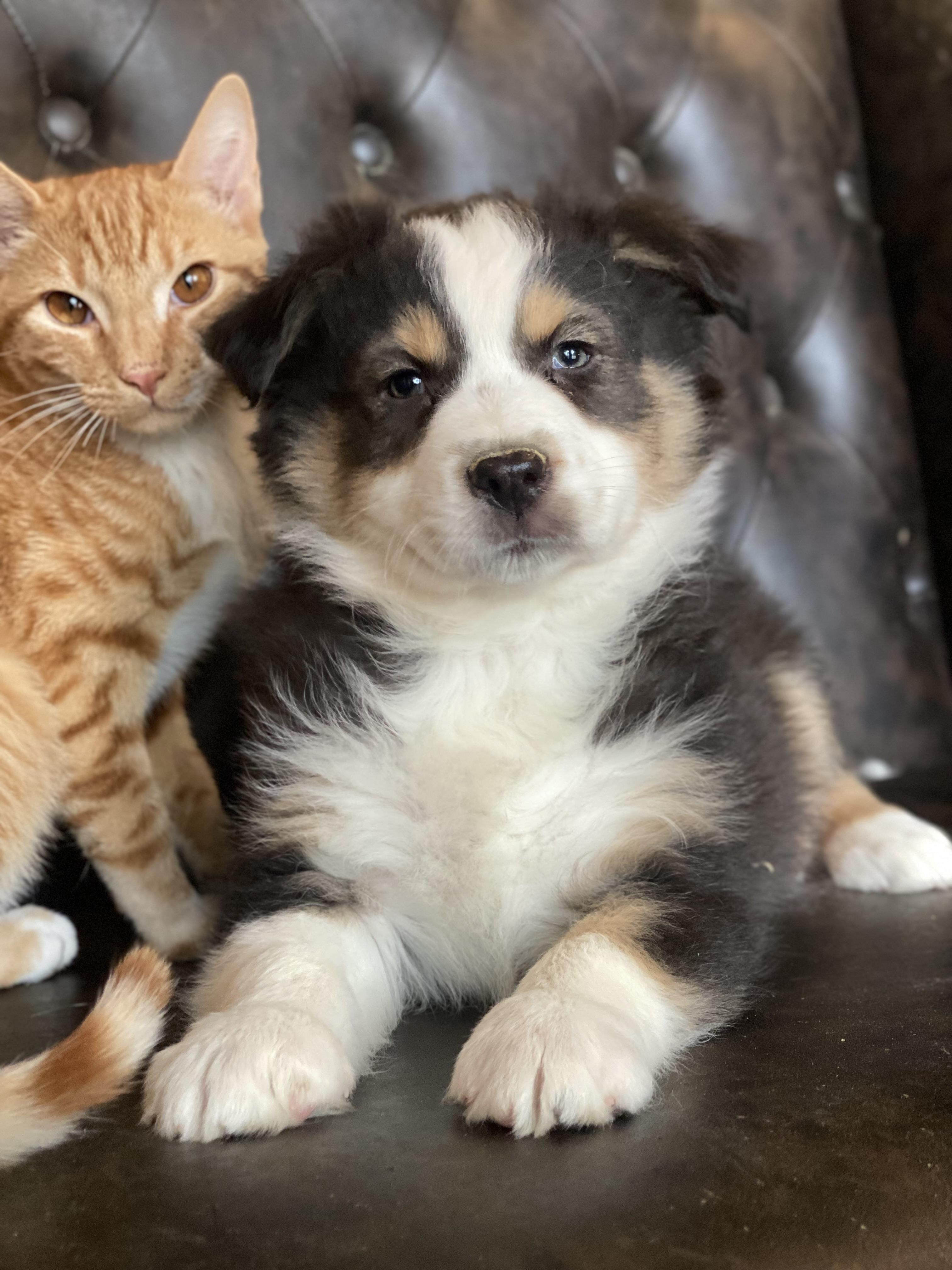 Our Aussiedoodle puppies include blue merle, red merle, black and white, and red tri-color. Australian Shepherd puppies include red merle, blue merle, black tri-color, and red tri-color. Colors will vary depending on the parent dogs.