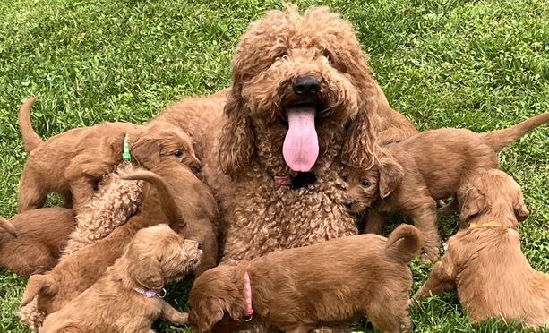 Quinn is a super sweet & super curly F1b goldendoodle. She loves to snuggle and considers herself a lap dog. This is Quinn's 3rd litter and we've had such high praises from her previous litters. She's a great mama to her babies!