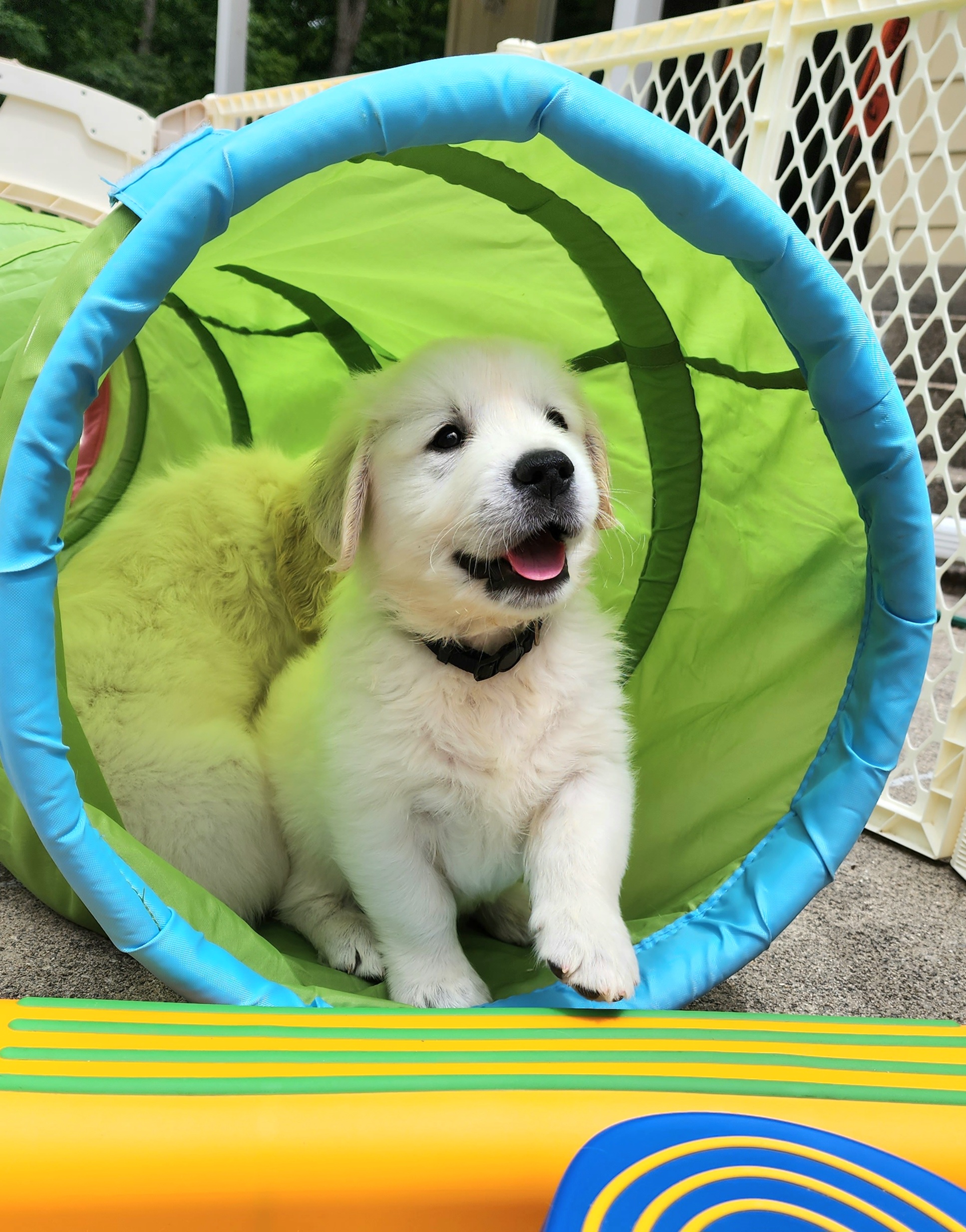 We raise these sweet goldens in our home where we are there most of the time. We aim for our puppies to know the world is safe, humans are good, and they can be confident trying new things. The BAB curriculum we use empowers these puppies and gives them in a voice in their placements with the temperament tests.