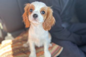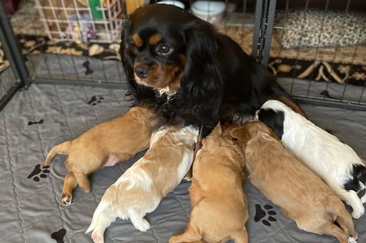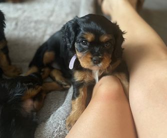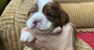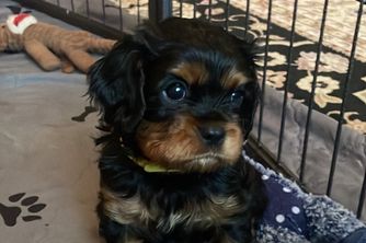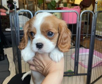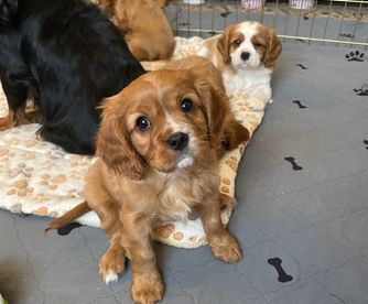 Our Cavapoo puppies include blenheim and apricot. Cavalier King Charles Spaniel puppies include blenheim, ruby, tri-color, black and tan, and chocolate. Colors will vary depending on the parent dogs.