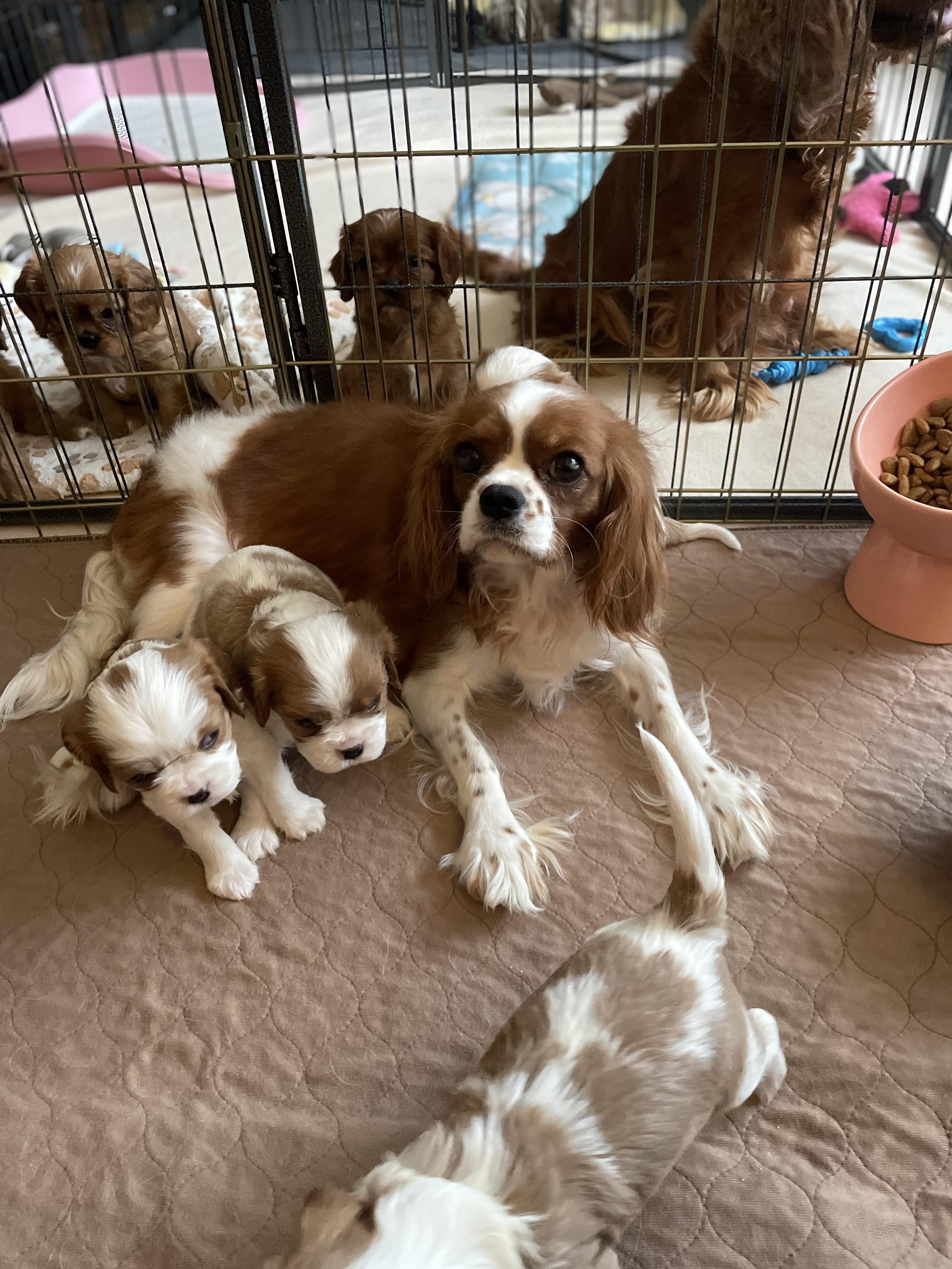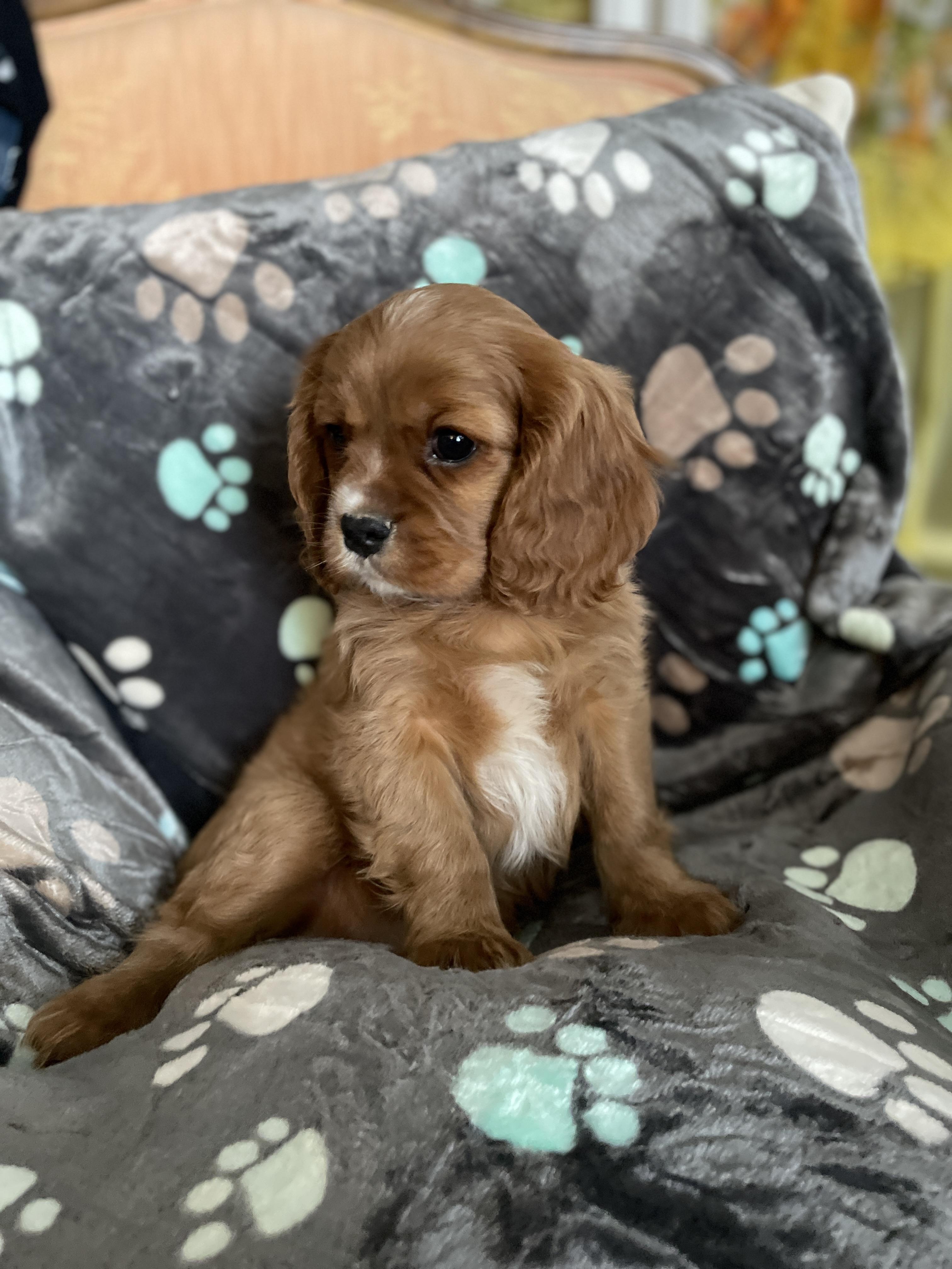 Our Cavapoo puppies include blenheim and apricot. Cavalier King Charles Spaniel puppies include blenheim, ruby, tri-color, black and tan, and chocolate. Colors will vary depending on the parent dogs.