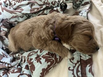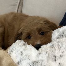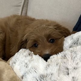 Sadie is a beautiful, F1 goldendoodle. She is a great mix of playful and cuddly. Her favorite things are playing fetch and being loved by her people. She is especially attuned when one of us is sick or down, she is always wanting to stay close. Sadie has been health tested and cleared to be a mom!