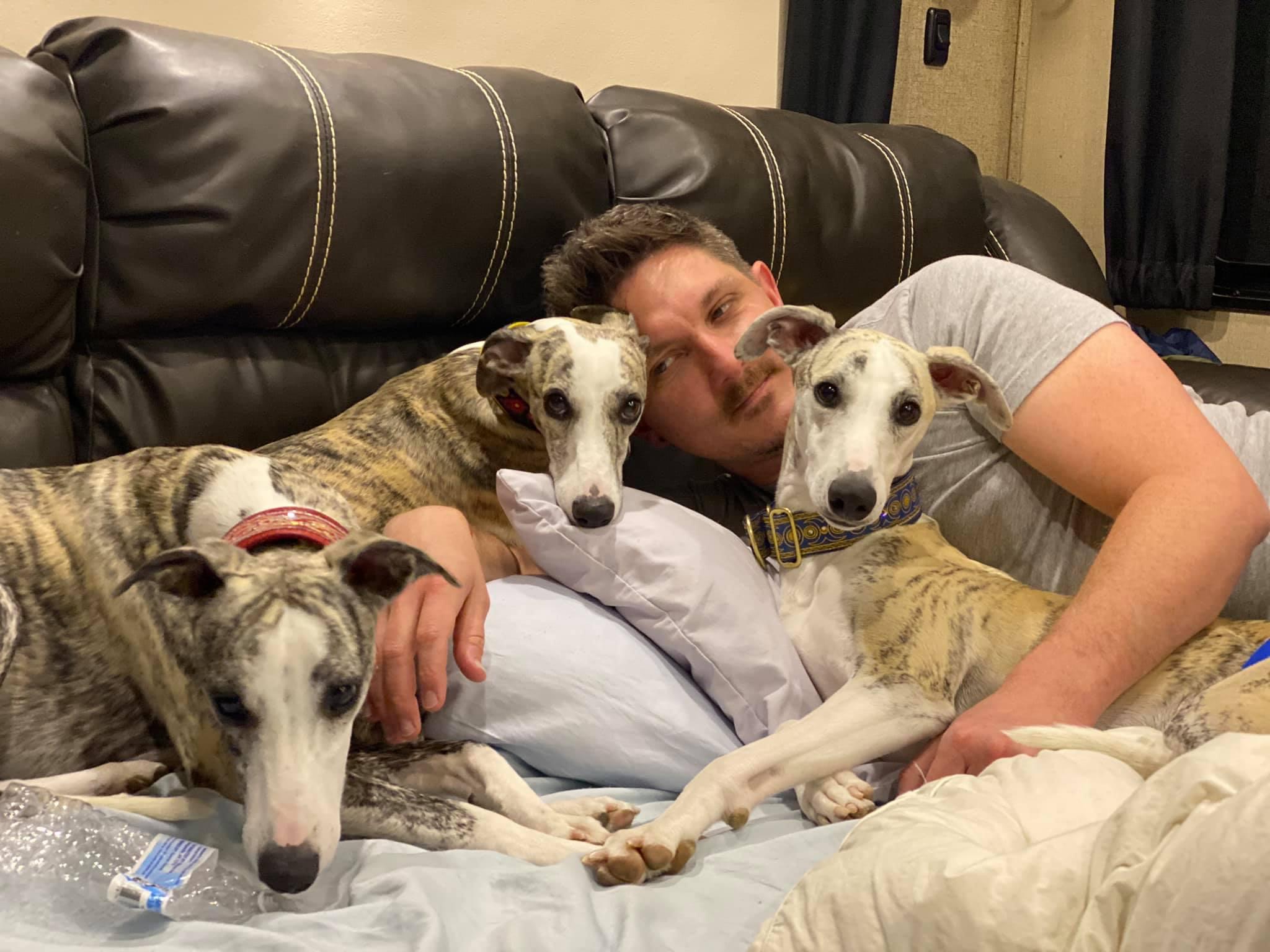 Alex and his partner, Kevin, met their first Whippet on a sidewalk in Chicago one summer afternoon. Ten days later, they had their first Whippet (from Maureen)! Six months later, their second Whippet puppy finished her AKC championship. A year later, they bought a house on an acre lot so the dogs could safely do what they love to do: RUN!