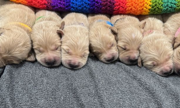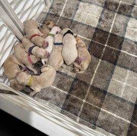 Our Golden Retriever puppies include dark golden, golden, and light golden. Colors will vary depending on the parent dogs.