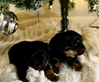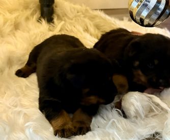 Our Rottweiler puppies include black and tan, black and rust, and black and mahogany. Doberman Pinscher puppies include black and rust and red and rust. Colors will vary depending on the parent dogs.