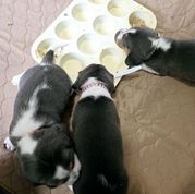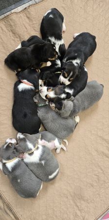 Our puppies include brown white and tan, black tan and white, and blue tan and white. Colors will vary depending on the parent dogs.