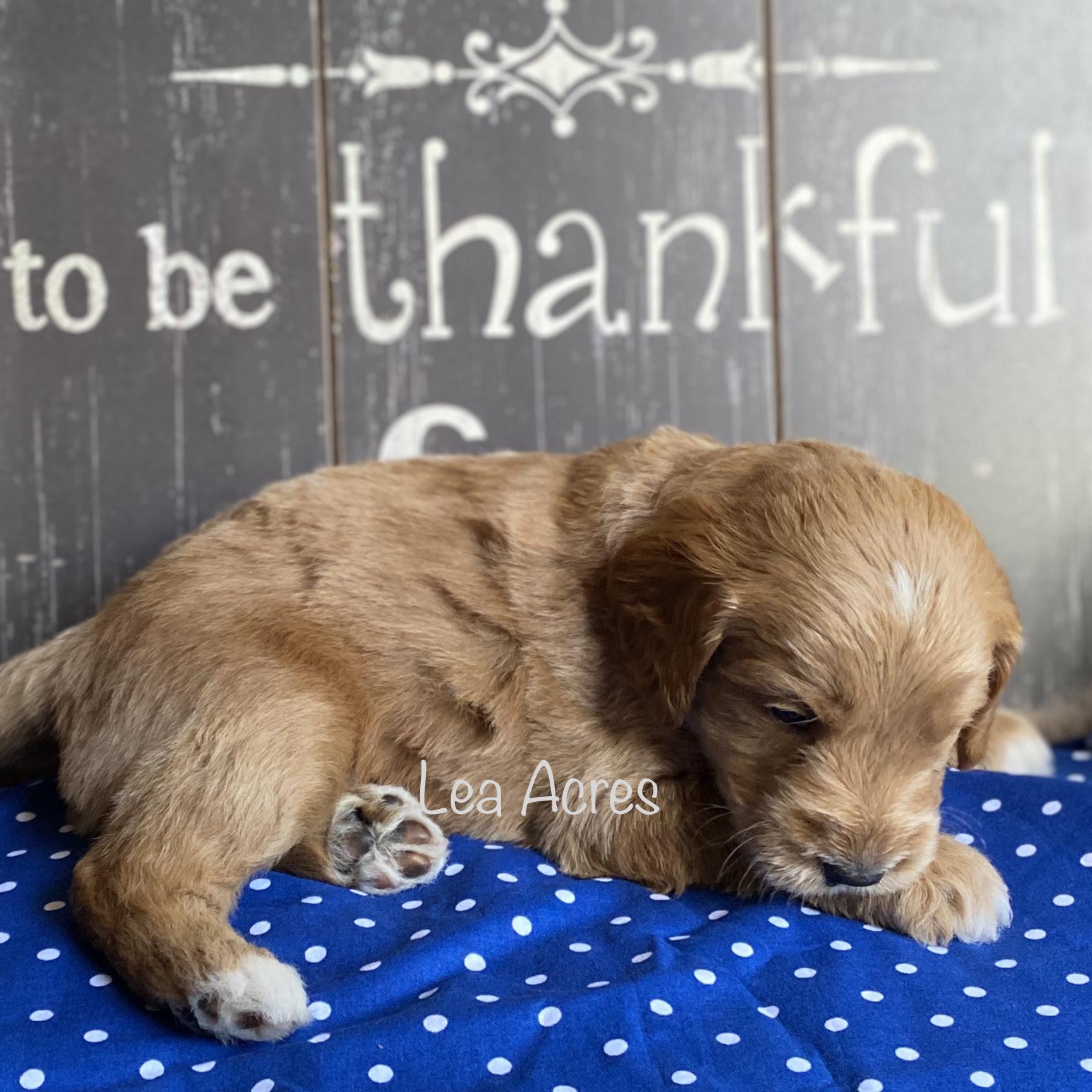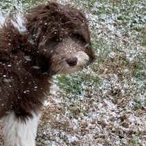 Aurora is so sweet and gentle natured. She loves to be cradled like a baby in my arms and always up for a car ride. She is small in size with a beautiful caramel fleece coat. Love this pairing so much we kept a female (Scout) from Buddy and Aurora's prior litter.