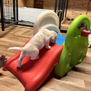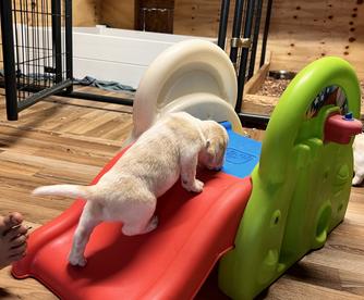 4.5 weeks old, exploring new toys and noises! We also get visits from our BIG new buddy!
