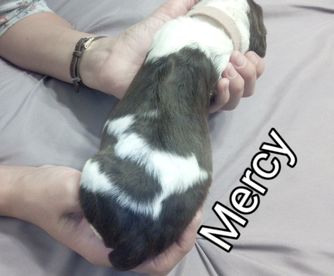 Happy is so sweet but very busy.. we are up playing at 5:00 and he is so good about going outside to potty. Loves his hugs and tummy rubs. We are loving him. He visited our vet last week for his vaccine and has another appointment next month. He is a chewer and we are working on that.. no liking a leash so we have given up on that till later.. too hot for walks anyway!!