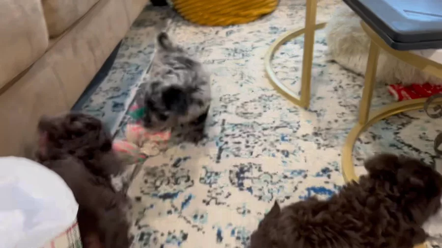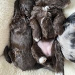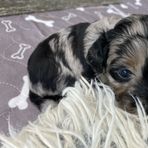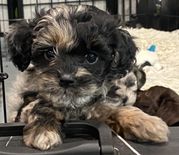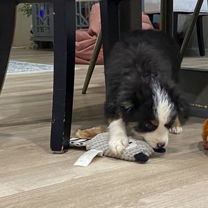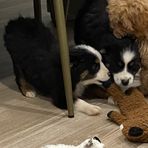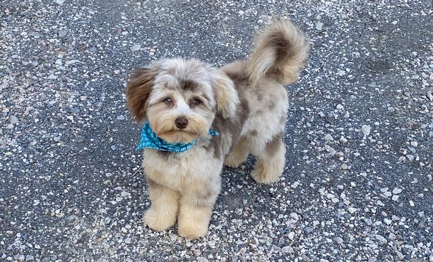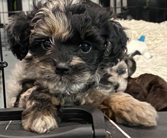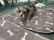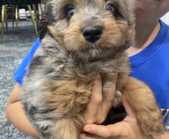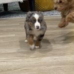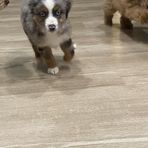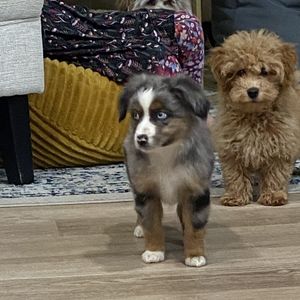 Our Aussiedoodle puppies include sable, blue merle, red merle, black phantom, black and white, and black tri-color. Toy Australian Shepherd puppies include black tri, blue merle, red merle, and red tri. Colors will vary depending on the parent dogs.