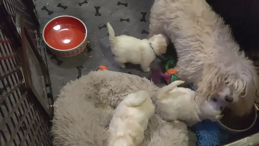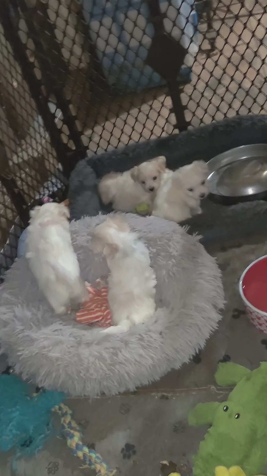 Carolyn answered every question we asked about the puppies, she even told us things we hadn't thought to ask yet which was very helpful. Carolyn was quick to respond to questions, even those asked fairly late in the evening. The adoption process was easy and pleasant and the puppies are real sweethearts. They are intelligent and easy to train, and they do like to talk to us sometimes. We received weekly pictures of the puppies as they grew and really liked being able to see them as they got closer to the age where we would get to take over their nurturing. The puppies each had a gift bag with them, which included a large stuffed toy dog, the toy was bigger than they were, the little girl is really attached to the white puppy, she likes to cuddle with it when she takes naps. The puppies spend most of their time in an indoor playyard, each day they spend a little more time outside of it. This way they have been able to see the older dogs and the older dogs have been able to see them without anybody being able to bother the other too much. The puppies are almost eleven weeks old and actually sleeping through the night, we believe part of the reason they are so comfortable is that they are cuddling with each other. The little boy puppy is now called Moki, which means precious in Japanese. And the little girl is Yuki, which means snow or happiness in Japanese. Carolyn was very knowledgeable and we had a good relationship on the phone and through text messages.