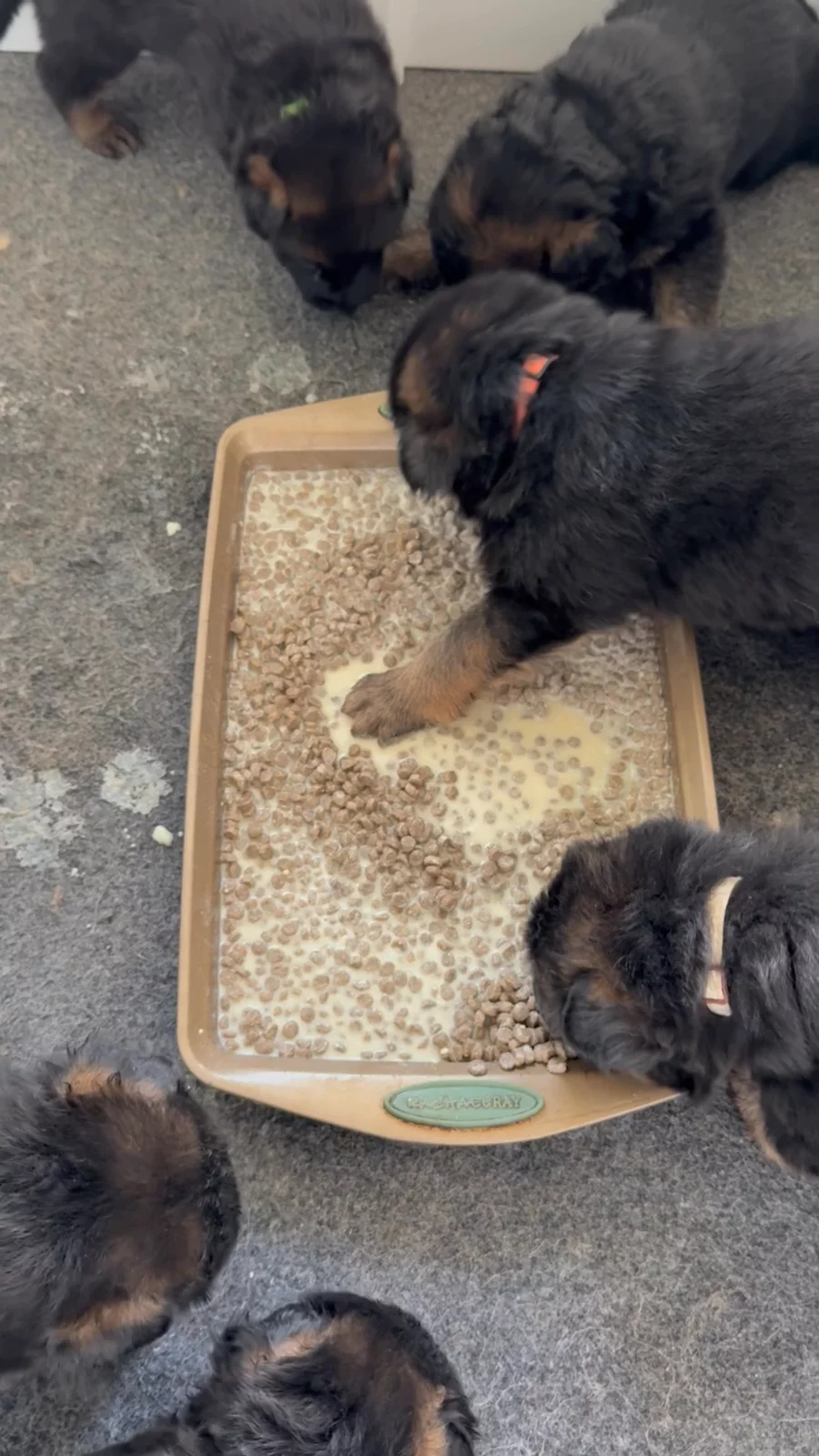 Our puppies include black and red and black and cream. Colors will vary depending on the parent dogs.