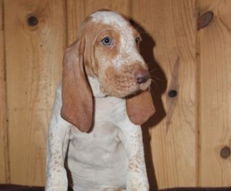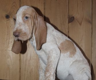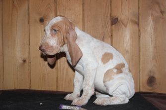 Our Bracco Italiano puppies are white and orange. Colors will vary depending on the parent dogs.