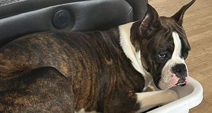 Violet is a sweet cuddly smart loyal girl. A perfect day for this sweet girl is cuddled up with the family on the couch. Violet often mistakes herself for a tiny lap dog.
