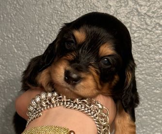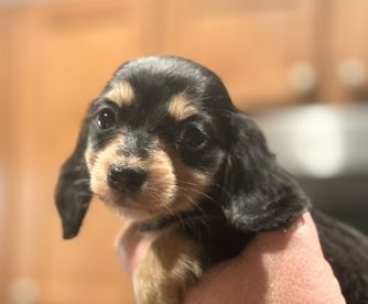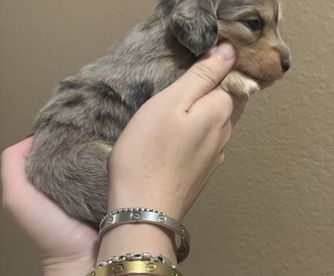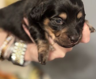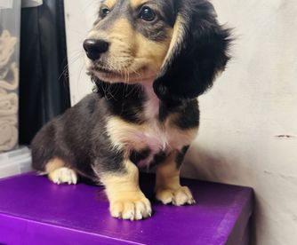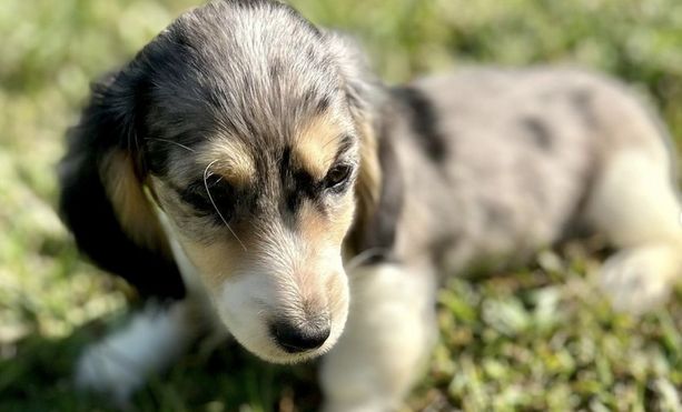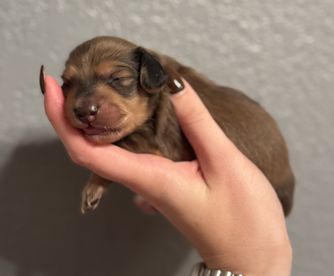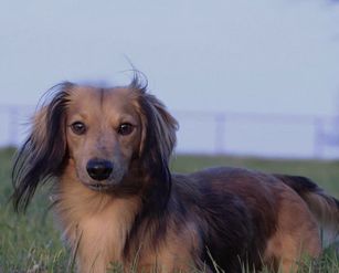 Mattie is a black & cream longhair female miniature dachshund. She is spunky, laid back, but full of personality. She is AKC Registered.