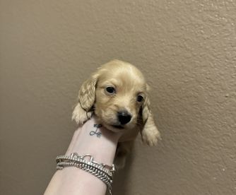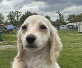 Mesa Jane is a CKC Registered Shaded Cream Long hair female miniature dachshund. She loves kids & is FULL of personality. She loves sleeping with her humans & is a big part of our family. She is a very petite size & throws the most precious puppies crossed with Jagger.