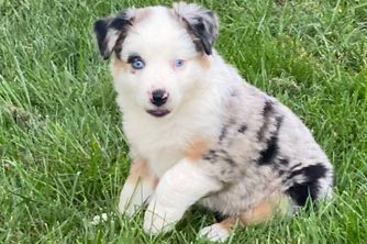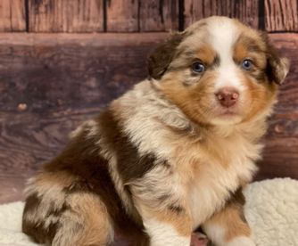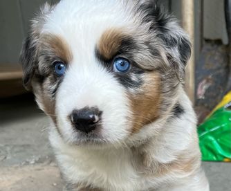 American stock dog registered purebred Red Merle with gorgeous blue eyes. I always say about Roscoe that he looks like a person behind those eyes! He is extremely loyal protective of the Farm and our children. Well trained smart and obedient. Loves belly rubs and says hello by giving his paw. Loves to take rides with the wind blowing in his hair. Great family dog, healthy, strong, and Faithful friend!