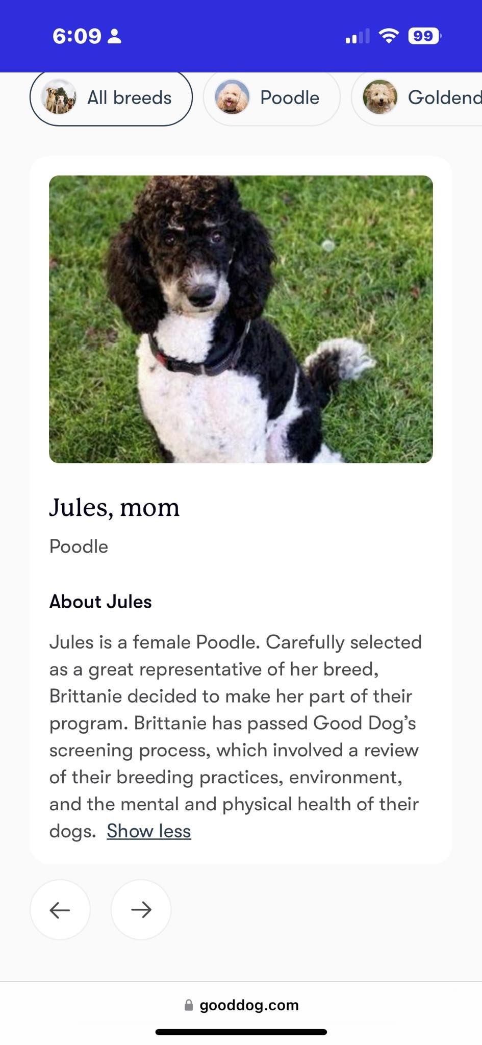 Cherish has been certified by Good Dog’s screening team for responsible and trusted breeding practices. When you’re ready to reach out, feel free to ask any questions about the breed, their program, or specific puppies.