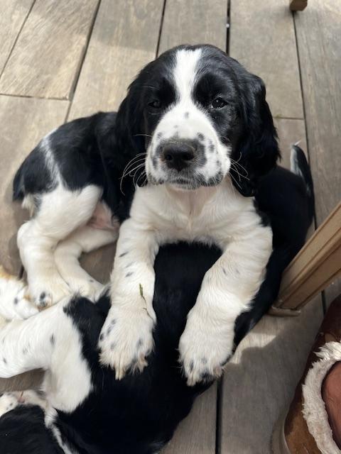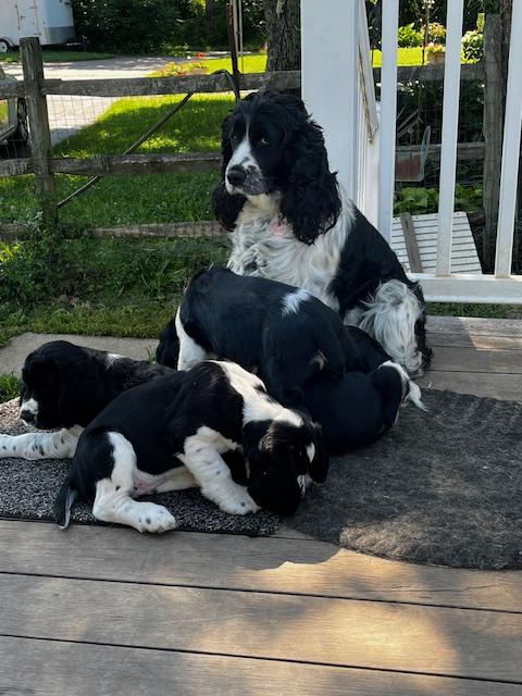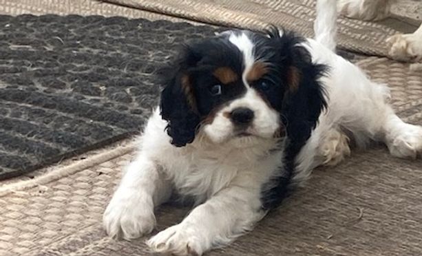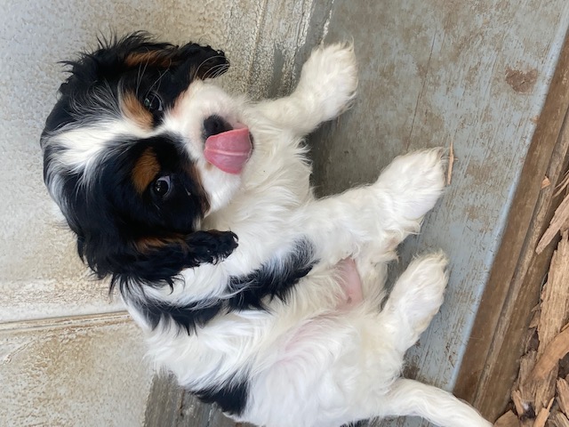Our Cavalier King Charles Spaniel puppies include black and white and tri-color. English Springer Spaniel puppies include black white and tan, black and white, and liver white and tan. Colors will vary depending on the parent dogs.