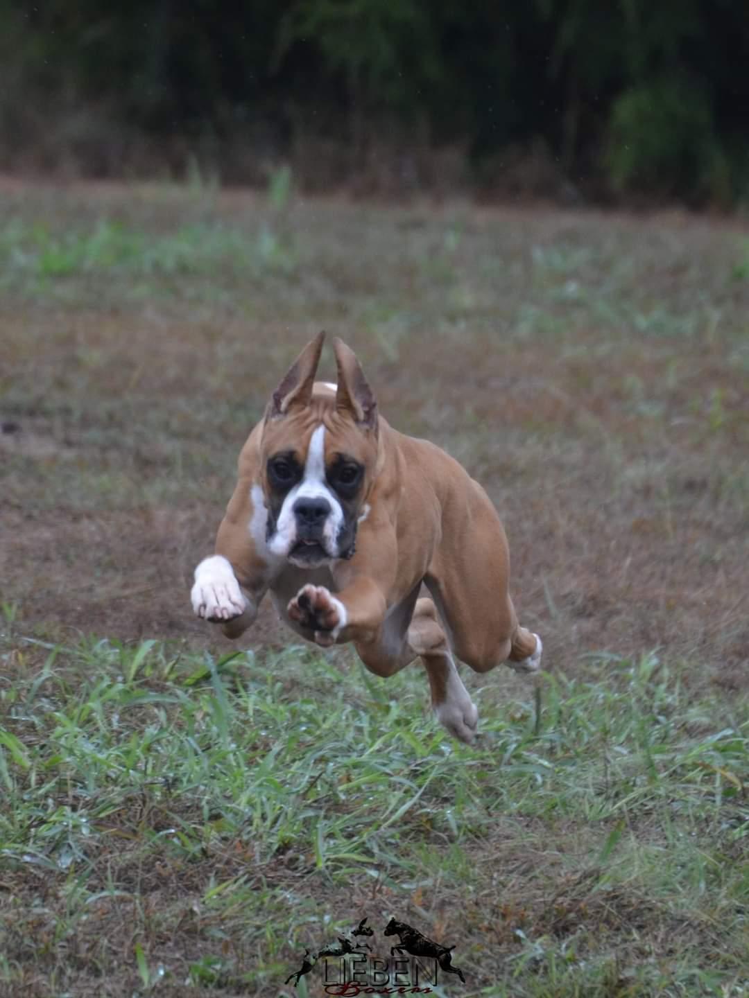 Pineapple, Lieben's Pride & Joy, is produced from Emma's third litter, born October 12th, 2022. I made the big decision to breed Emma via Surgical Insemination to a stud by the name of Reggie, GRCH., CH Schoental's Reginald FDC SIN SEN RATN TKN, who made Boxer History at Boxer Nationals 2021. Reggie was owned and loved by Nadine Kuhlemeier, Bobbi Compton and Gyleen Fitzgerald. The litter was hand raised and very special to me, as Reggie recently passed earlier that same year unexpectedly. Pineapple is a lively spitfire and keeps everyone on their toes. She is apart of the new Lieben lineup and has some big paws to fill in the Lieben bloodline. She is a gorgeous flashy fawn thar fits beautifully to the Boxer standard and hopefully will make both her parents proud in her future show career. Pineapple has dtarted both her UKC & AKC show career already and already close to obtainingher UKC Championship title! We will also be trying new events like barn hunting, dock diving, scentwork and other fun events. There are BIG things planned in the months ahead for this beautiful flashy fawn princess!