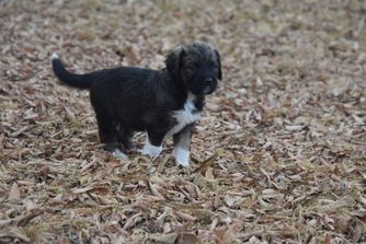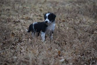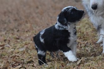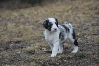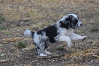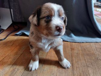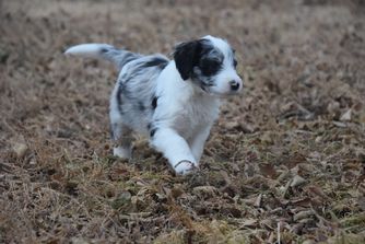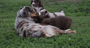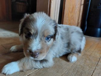 Our Australian Shepherd puppies are red merle. Aussiedoodle puppies include blue merle, red merle, black and white, and red tri-color. Colors will vary depending on the parent dogs.