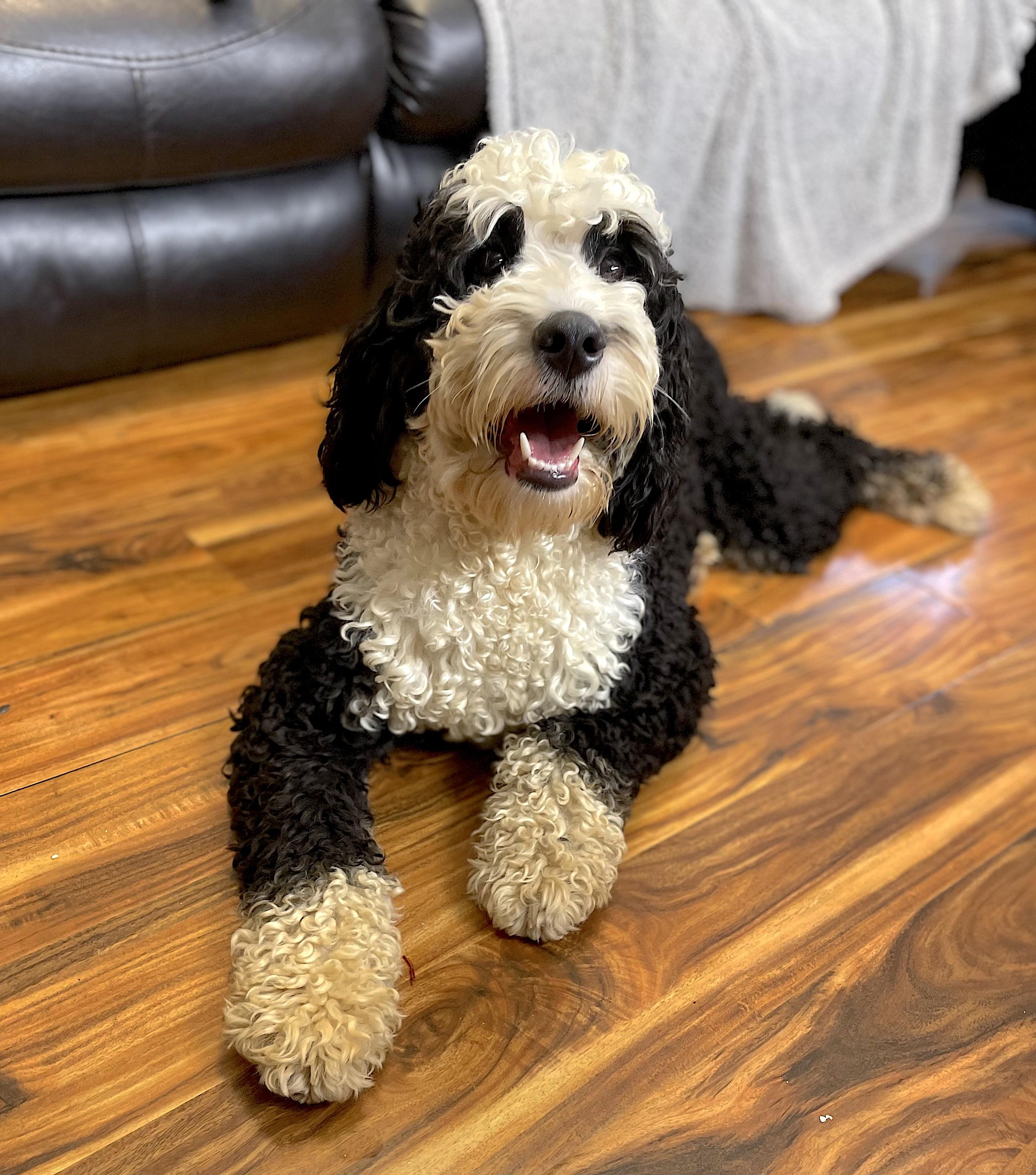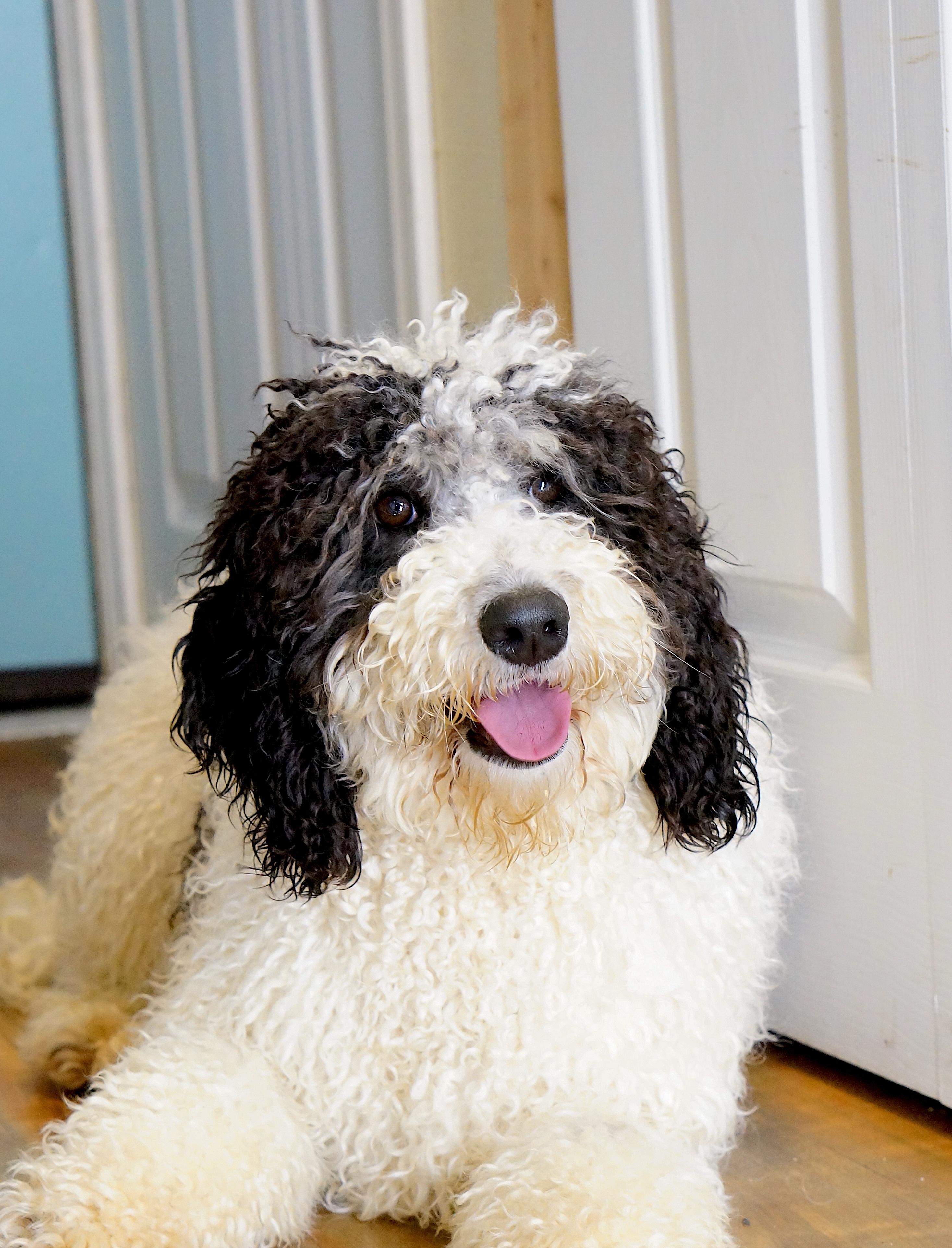 Lola is our F2 Miniature Bernedoodle. She is the happiest dog I know, and loves playing and romping with our kids.