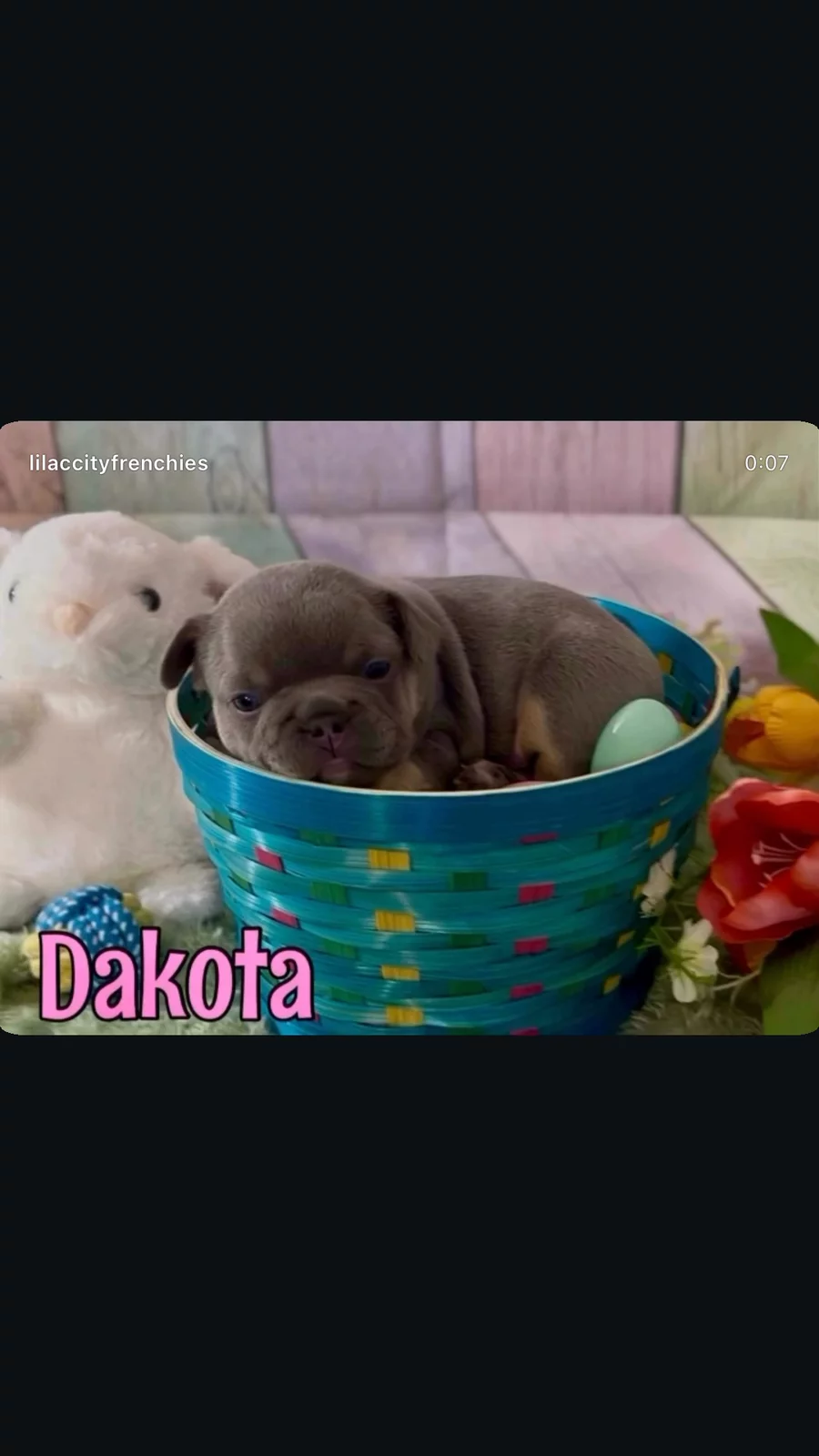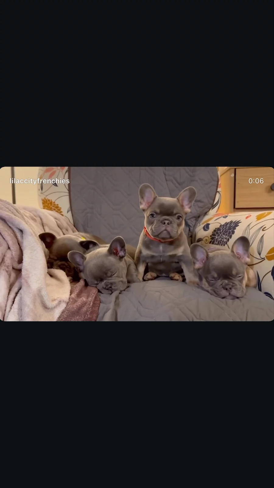 Kiki is a calmer girl, she likes to play and run around, but she is our “cat” dog. She would prefer to curl up on the couch with a chew toy, snuggle up on her dad, or go stretch out in the sunshine in the yard for a nap. That said, she does really love to play with children and is very sweet with young puppies, even when they are not her own. Kiki is a lilac tri color French Bulldog, she also carries one copy of rojo (deep reddish brown), as well as platinum, and fluffy! She has been health cleared by our vet and reproductive specialist, and is Four Panel clear via DNA testing through Embark. She is apx 22lb.