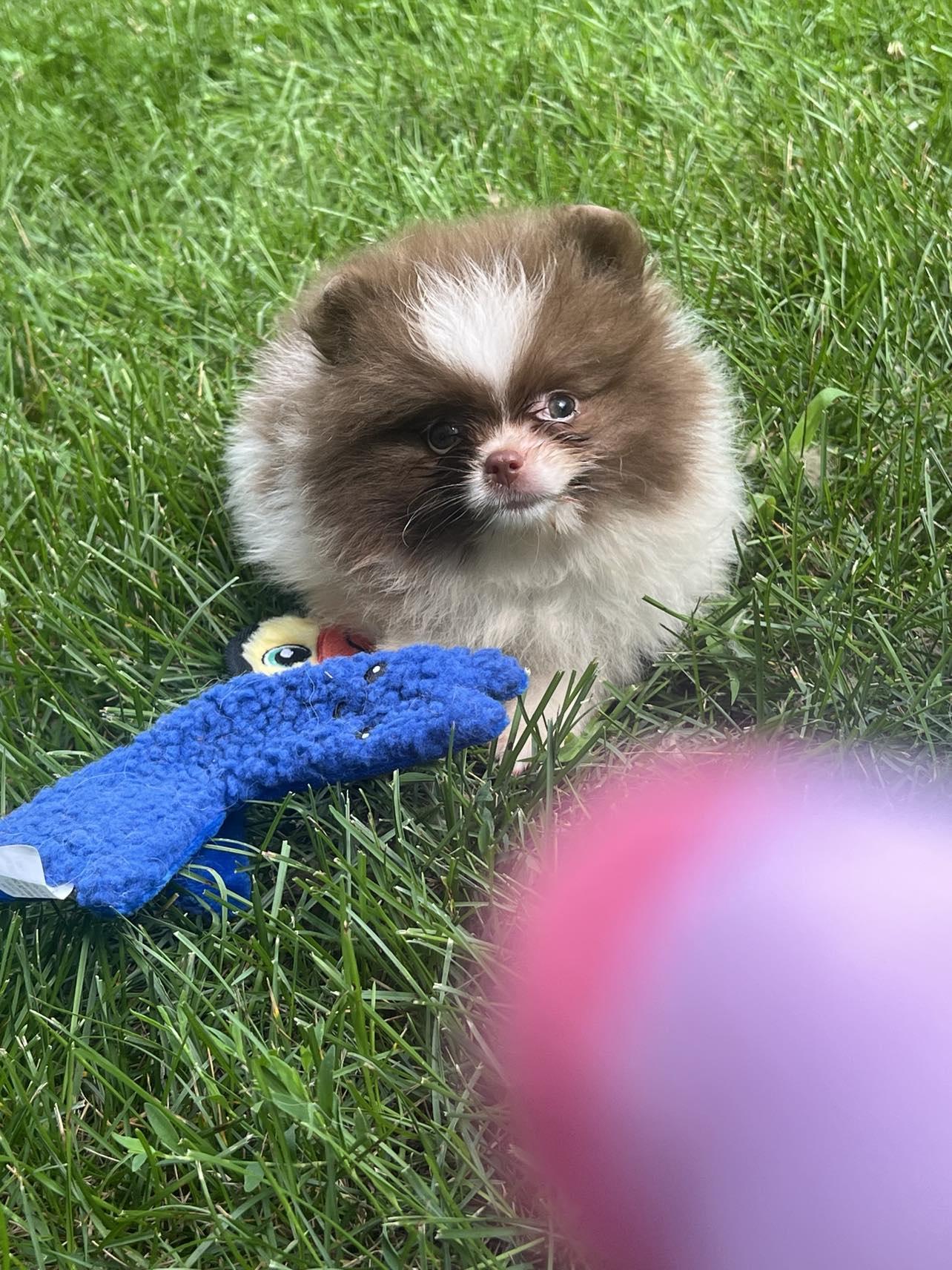 Our Chihuahua puppies include chocolate, chocolate brindled fawn, chocolate and white, chocolate and tan, black and tan, and blue merle. Pomeranian puppies include orange, chocolate, red sable, tri-colored, and chocolate merle. Colors will vary depending on the parent dogs.