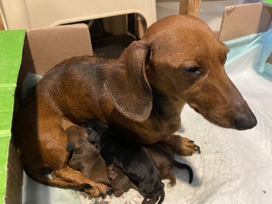 Olive is a female Dachshund. Carefully selected as a great representative of her breed, Lily decided to make her part of their program. Lily has passed Good Dog’s screening process, which involved a review of their breeding practices, environment, and the mental and physical health of their dogs.