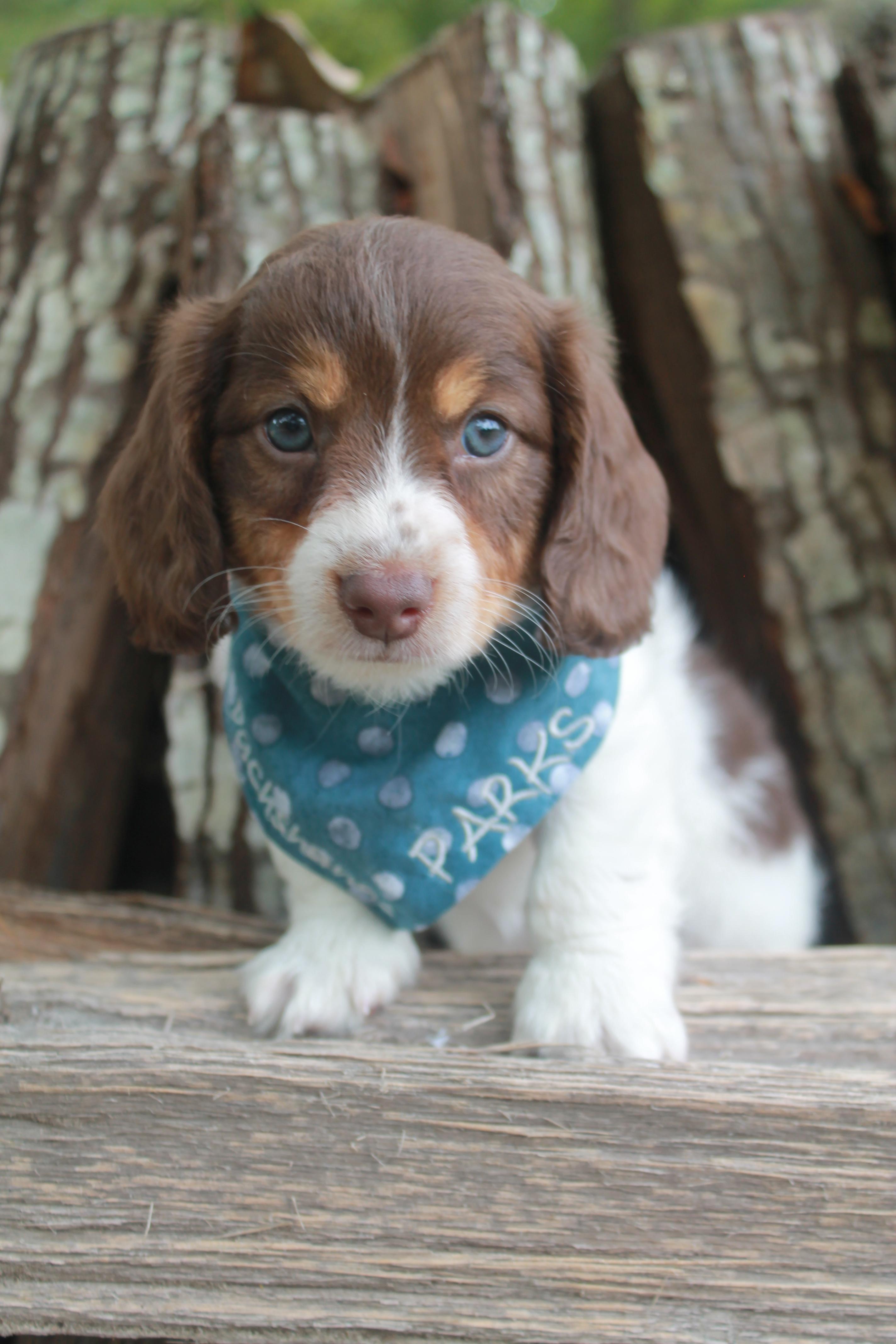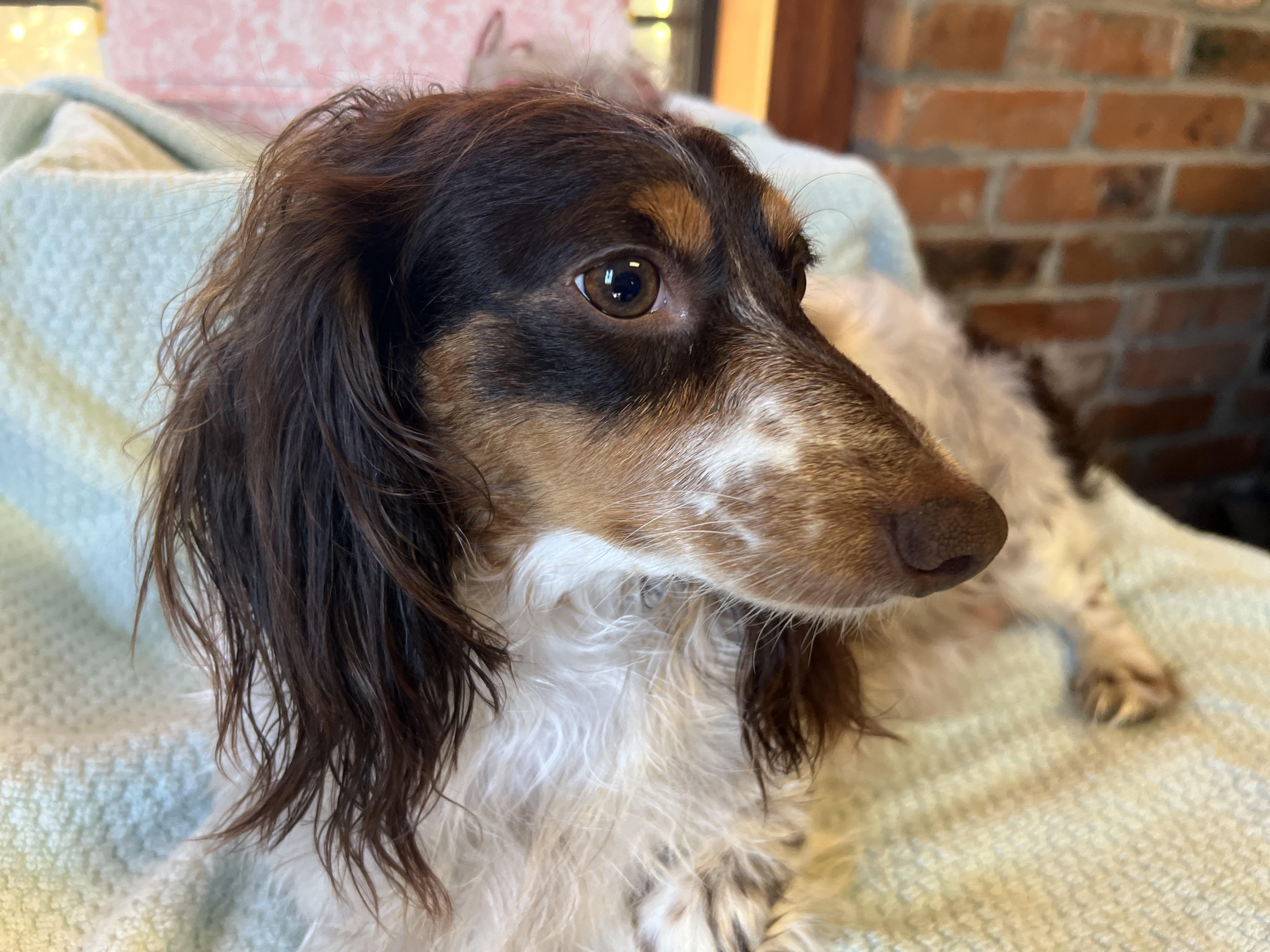 Poppy is a LH Chocolate Piebald! She is registered with CKC! She is considered a tweenie, not a standard and not a mini. Poppy is a very laid back sweetheart of a dog! Loves to be loved on! She’s a terrific mom to her babies!