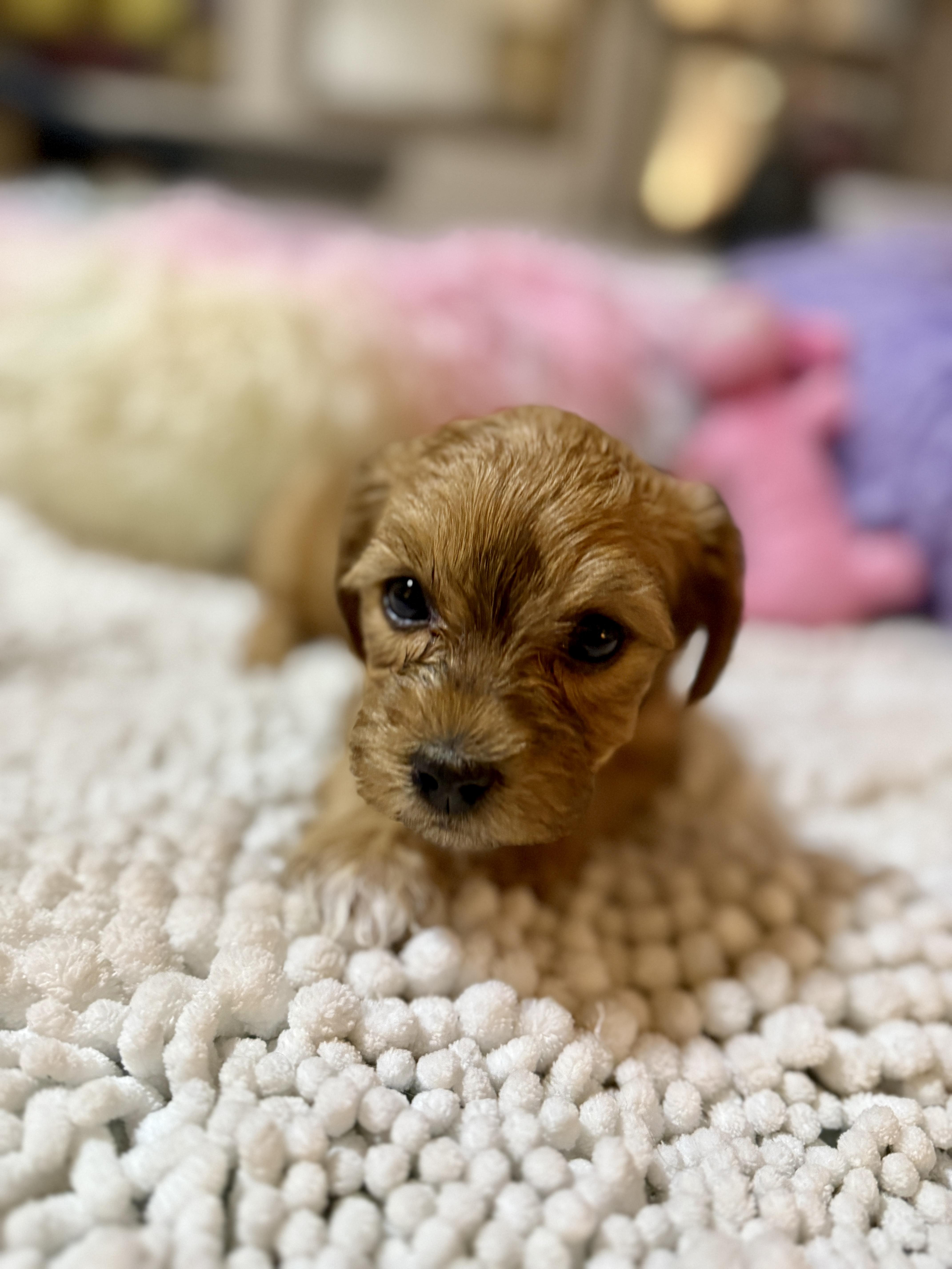 Lizzie is a Miniature/Toy Apricot Poodle. She is calm and an excellent mother. A calm mother produces calm puppies and this litter is a breeze to raise.
