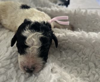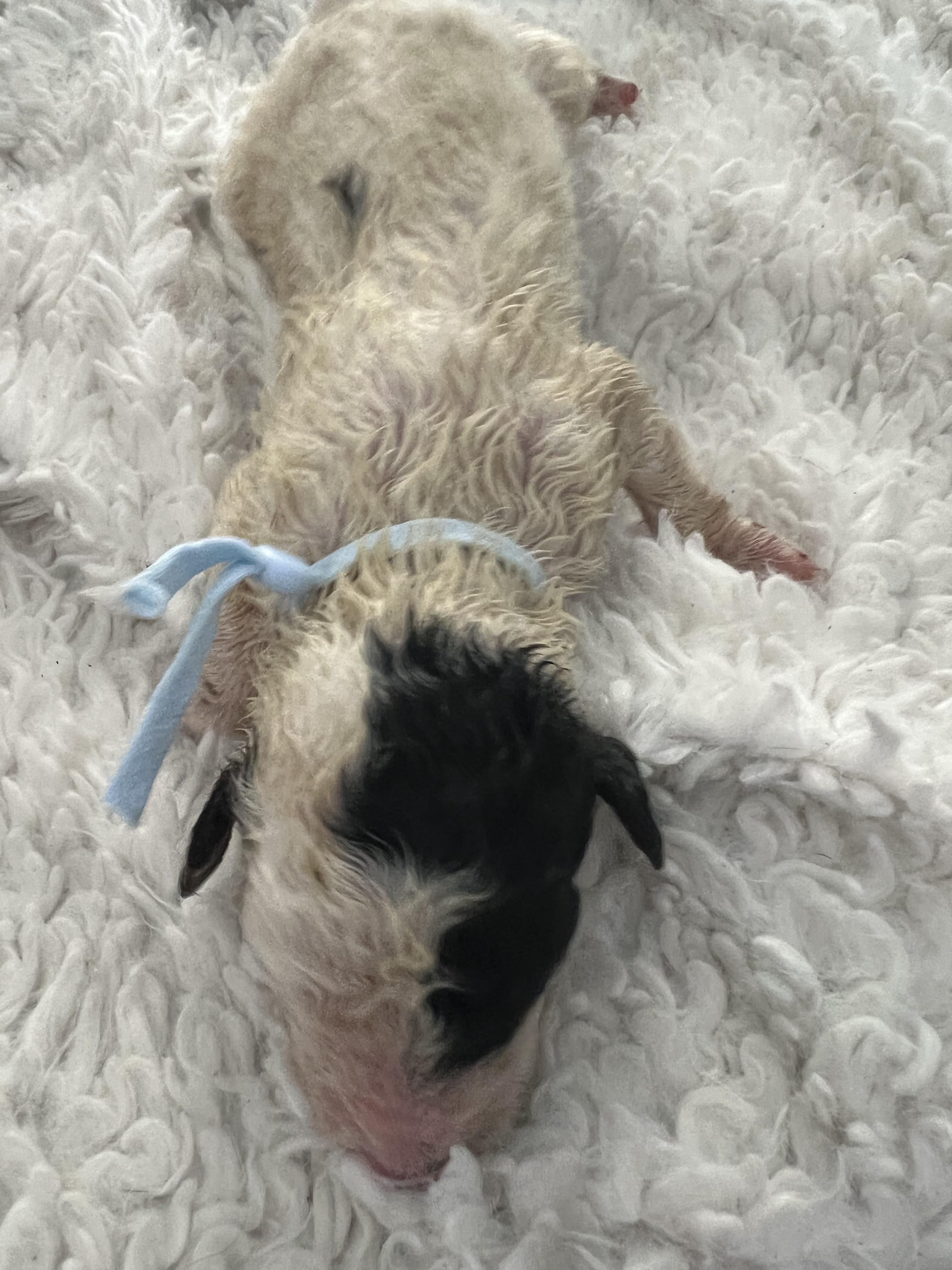 Our Bernedoodle puppies include sable, tri-color, and phantom. Goldendoodle puppies include cream, apricot, red, and parti. Sheepadoodle puppies are blue gray and white. Colors will vary depending on the parent dogs.