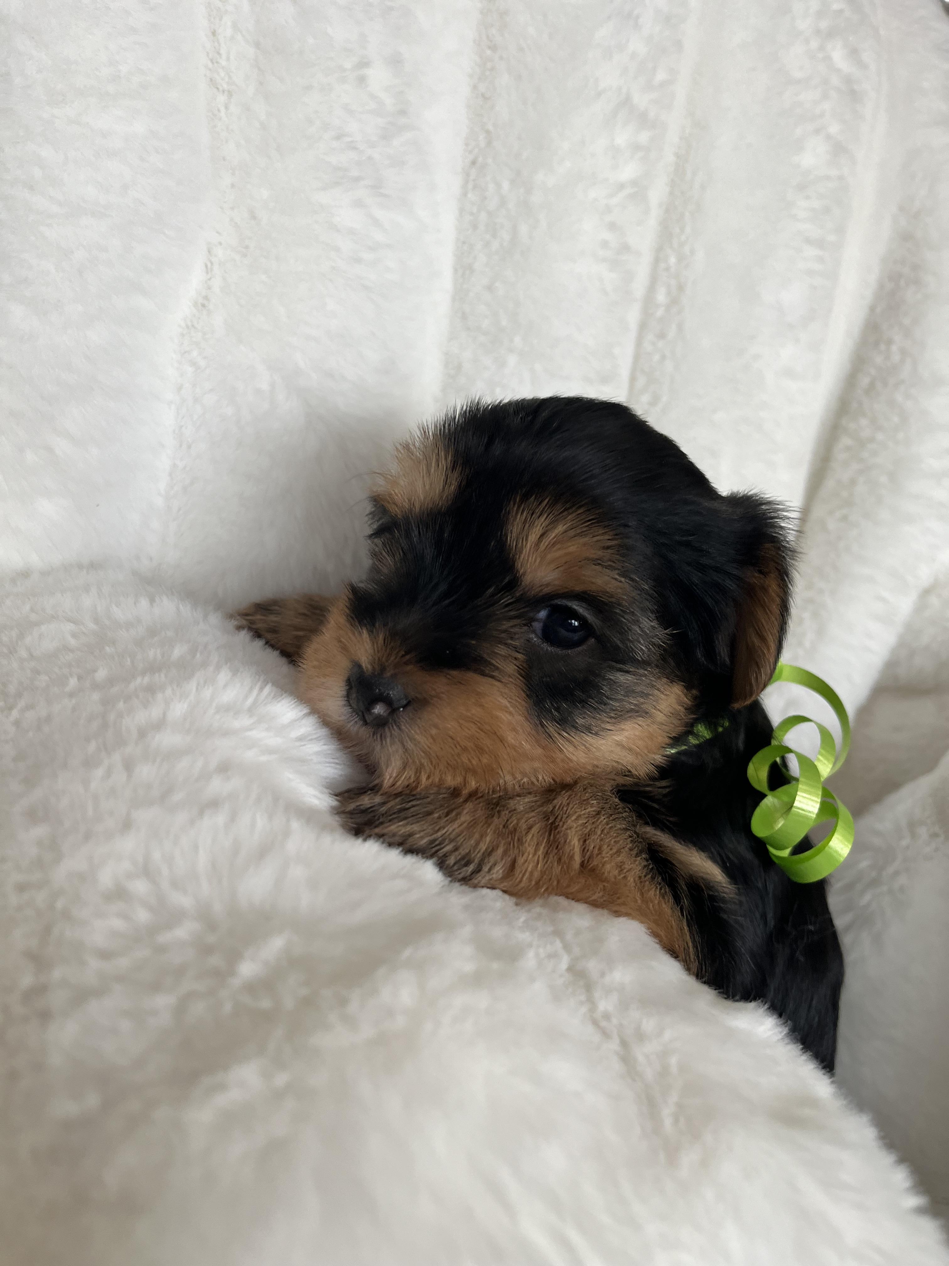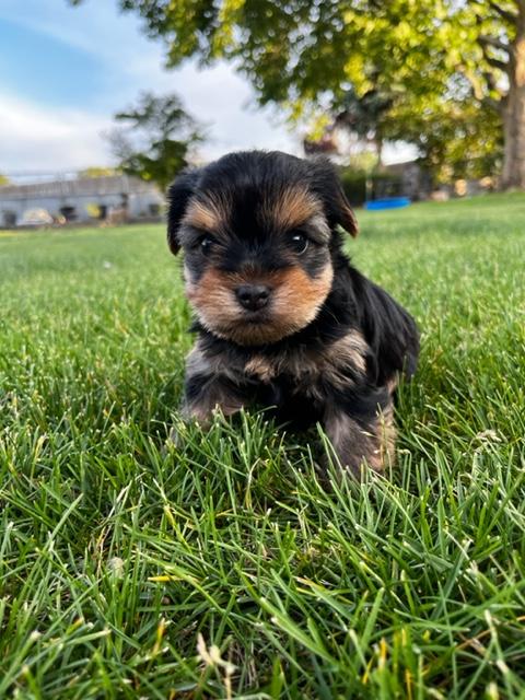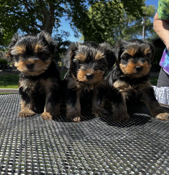 Yorkshire Terrier puppies include blue and gold, black and tan, and black and gold. Colors will vary depending on the parent dogs.