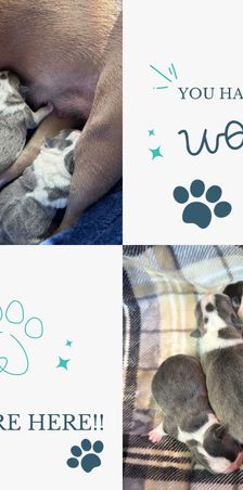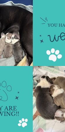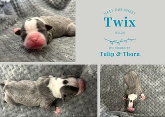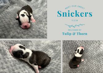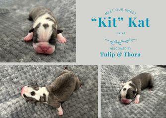 Our puppies include seal and white, black brindle and white, seal brindle and white, brindle and white, and black and white. Colors will vary depending on the parent dogs.