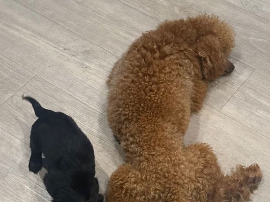 Rudy is gentle natured and loves children. He’s a snuggly boy. And is an expert with toddlers our plan was to place Rudy into a Guardian home, but he stole our hearts. He’s a very sweet, smart boy who loves toys and outings with the family. I would say his energy level is definitely lower than other poodles .