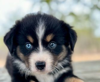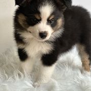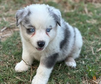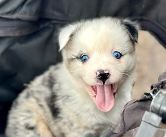 This is Sam and Stumpy. They are both black tri with a dilute factor which makes them gray. Unique pups with lots of personality. Ready to go home in 2 weeks.