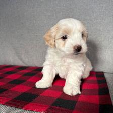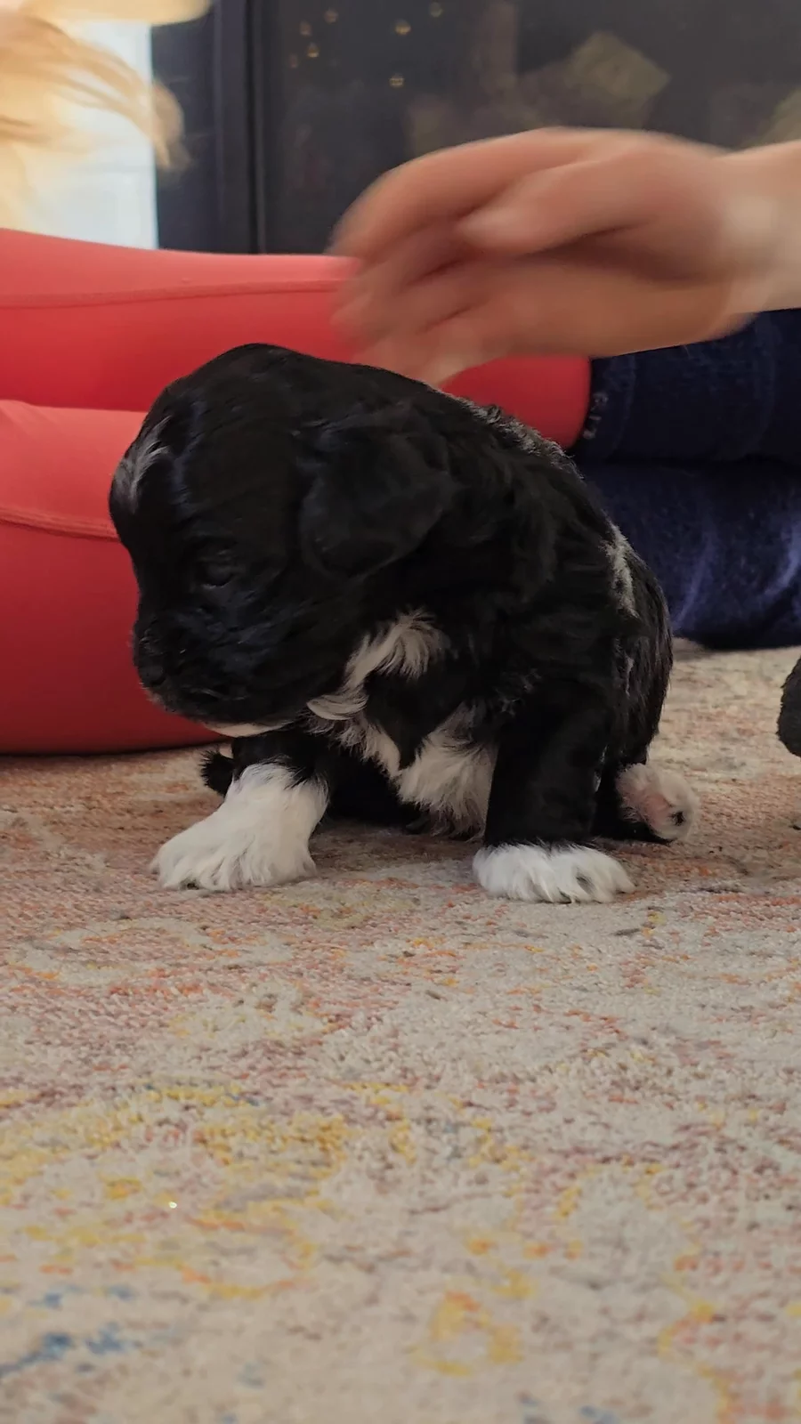 Dolly is the chillest and most cuddly of the three. She has a relaxed, easygoing temperament but still enjoys playtime when the mood strikes. She especially likes being held and is content to hang out quietly with her people. She’s a great fit for someone looking for a calmer puppy with a snuggly personality.