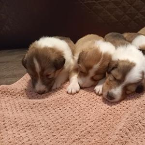 Our puppies include sable merle and white, blue merle and white, black white and tan, and sable and white. Colors will vary depending on the parent dogs.