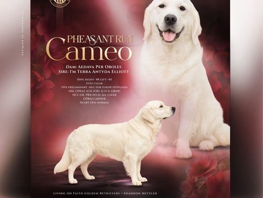 Living on Faiths Golden Retrievers reports to performing the health tests below on their breeding dogs. Ask your breeder about the tests performed on the parents of your litter. Learn more about health testing for Golden Retrievers.