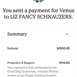 We purchased Jupiter from Elizabeth and we couldn’t have been happier with not only her kindness but also with her professionalism and passion for these beautiful dogs. She was incredibly kind and responsive every step of the way. As far as Jupiter goes this is one of the most well behaved, sweetest, and beautiful dog I’ve ever owned. For the most part at 9 weeks he was potty trained and on an established schedule. He loves affection, being kissed and hugged and most of all being cuddled. Jupiter is the most wonderful addition to our home and I would recommend Liz’s Fancy Schnauzers to any and everyone!!