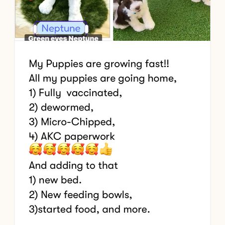 I highly recommend Elizabeth to anyone looking to purchase a puppy. Her professionalism, kindness, and thoroughness made the entire process so much easier and enjoyable.