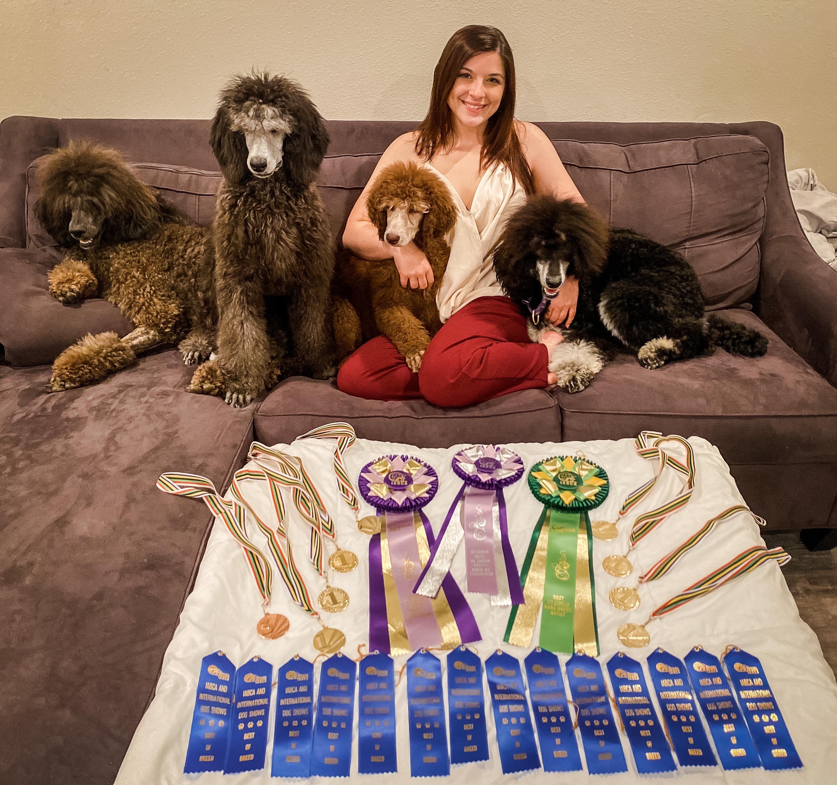 I got into breeding because my first poodle helped me with my anxiety and depression. I wanted to share my experience and love for poodles flexibility to work. They are brains, beauty, and able to do almost anything you want them to. I breed for workability and performance. I have had several mentors to help guide me through this journey.