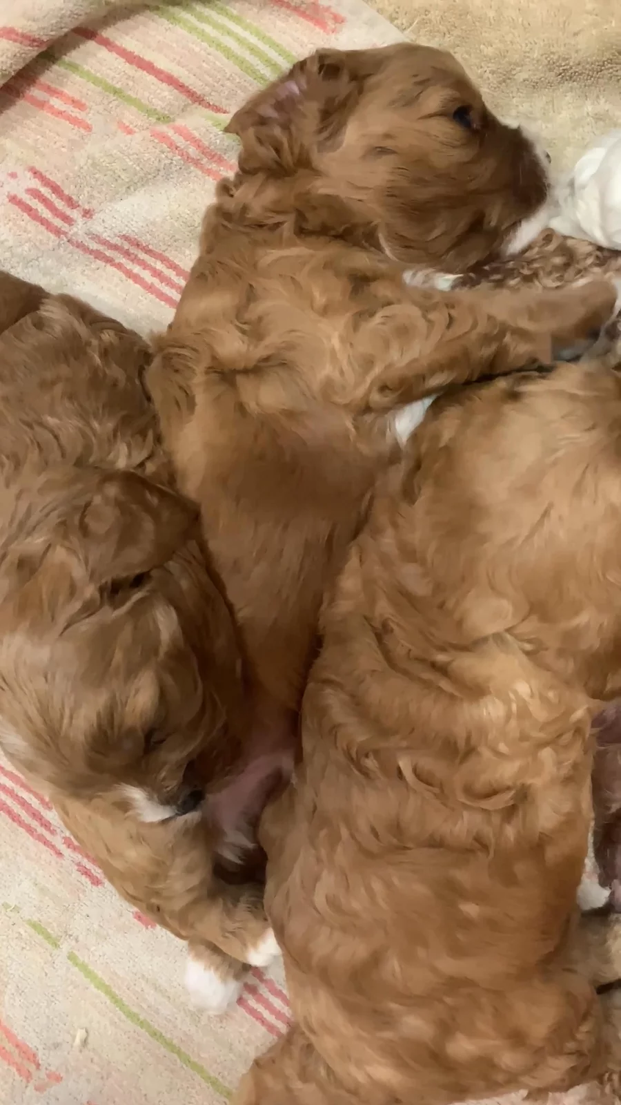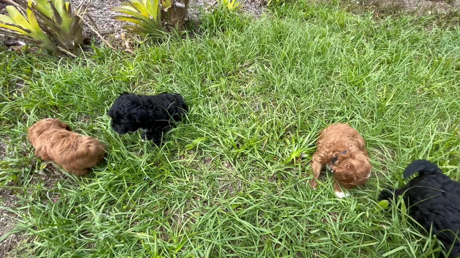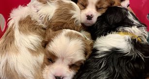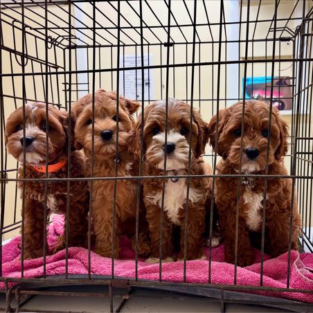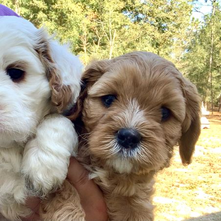 Our Cavalier King Charles Spaniel puppies include blenheim and tri-color. Cavapoo puppies include red, blenheim, and apricot. Poodle puppies include apricot and red. Colors will vary depending on the parent dogs.