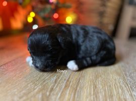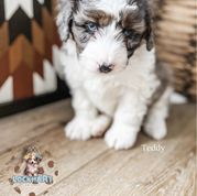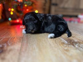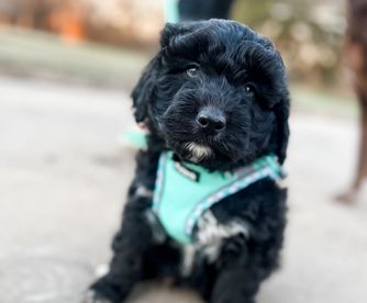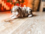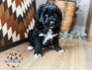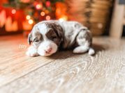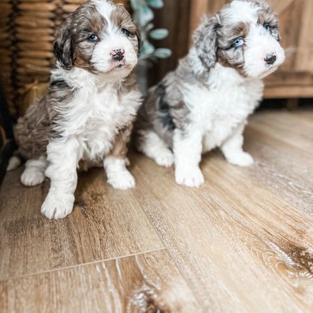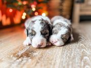 Our Aussiedoodle puppies include blue merle, red merle, black and white, and black tri-color. Miniature Australian Shepherd puppies include blue merle, red merle, red, and black. Colors will vary depending on the parent dogs.