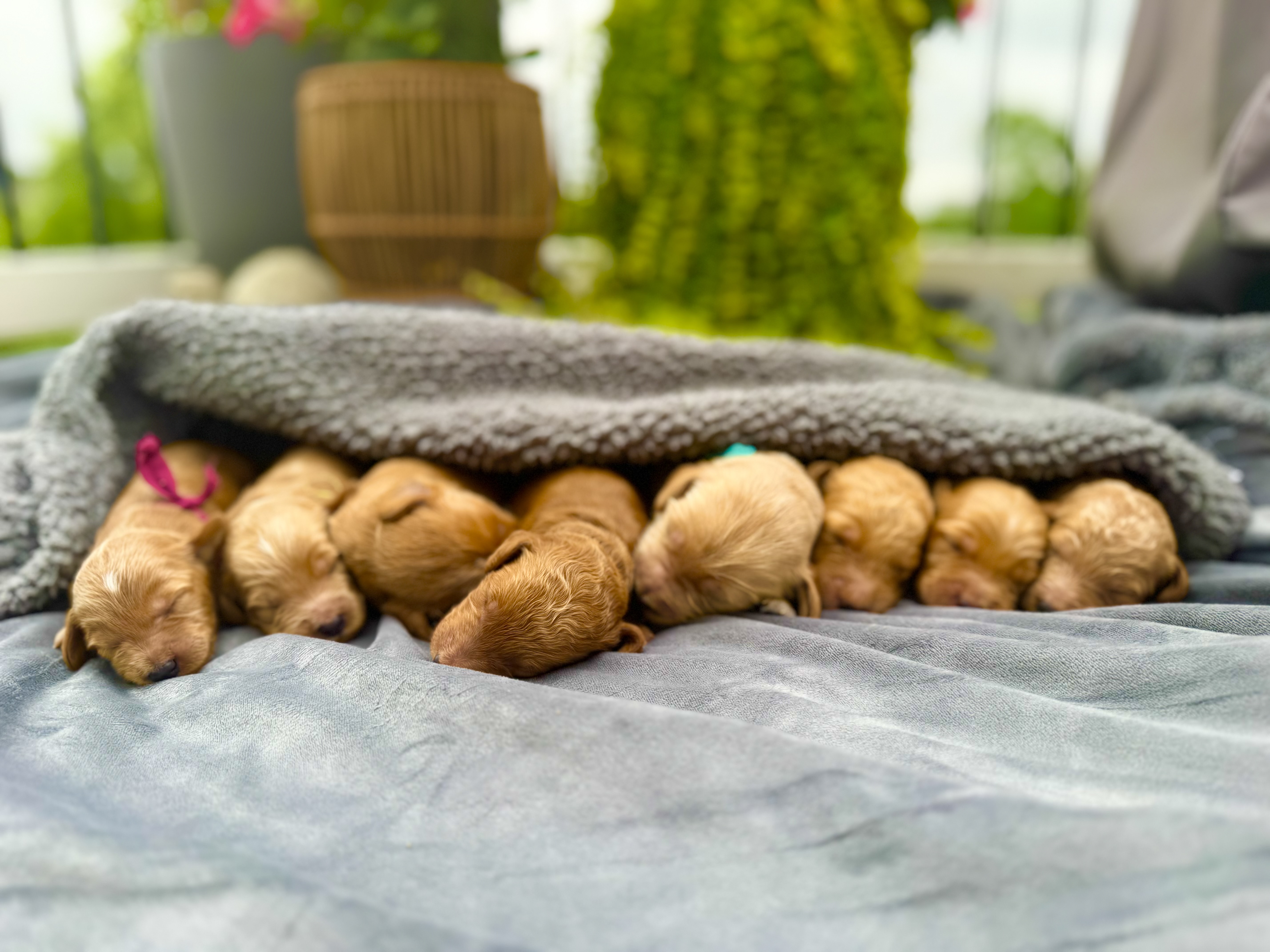 At our small, in-home program, every puppy is raised with love, intention, and care from the moment they’re born. From an early age, we introduce enrichment activities to support cognitive development and emotional resilience. Our goal is to nurture puppies who are physically thriving, well-adjusted, and confident, ready to become cherished companions in their forever homes.