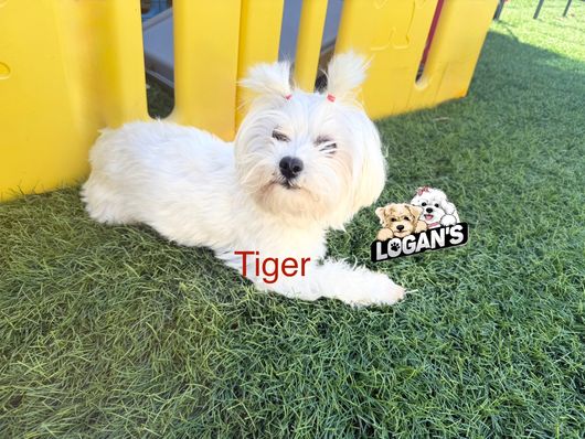 Tiger is a handsome, purebred Maltese with both AKC and ACA registration. With his snow-white coat and bright, expressive eyes, Tiger turns heads wherever he goes. True to his name, he’s got a bold little personality—full of spunk, curiosity, and charm. One of his favorite things in the world is being around children—he absolutely loves kids and is as gentle as he is playful. Whether he’s prancing around the house or snuggling in someone’s lap, Tiger brings joy and energy to every moment. He’s not just a dog—he’s family.